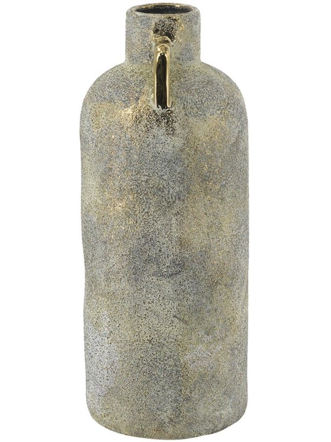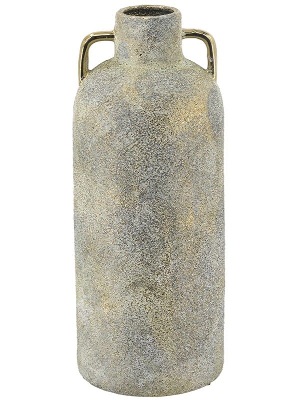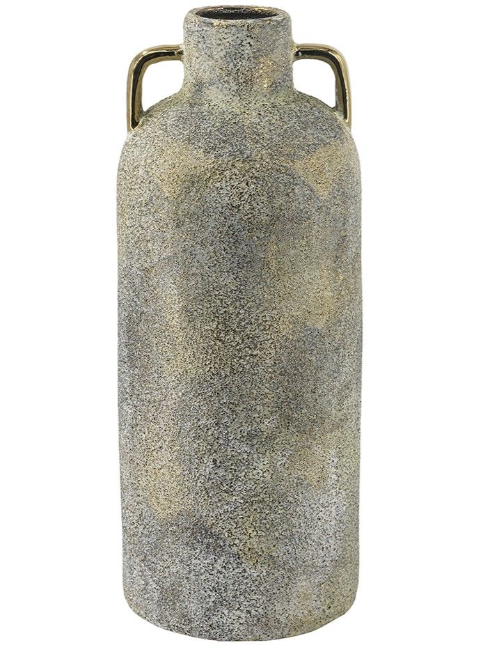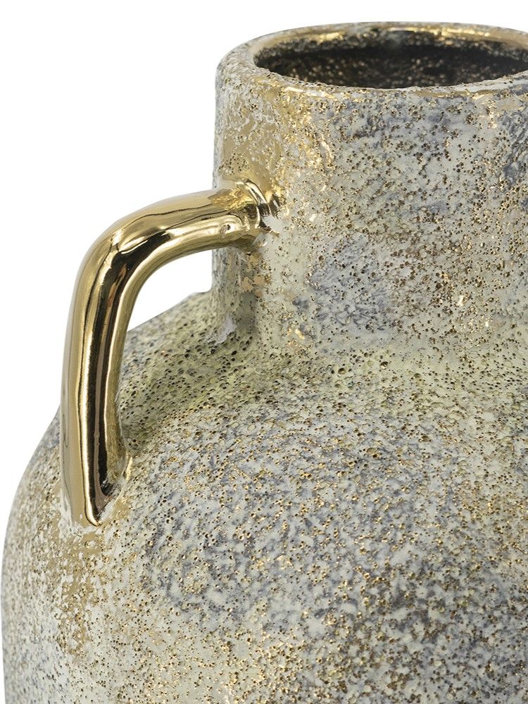 Керамическая ваза классической формы с двумя ручками, покрытая серо-коричневой глазурью с золотистыми оттенками, создана для цветочных композиций из сухоцветов и выполнена с цилиндрическим корпусом. Воплощает в себе современный дизайн и яркий декор, а благодаря лаконичности формы подходит для любого интерьера.