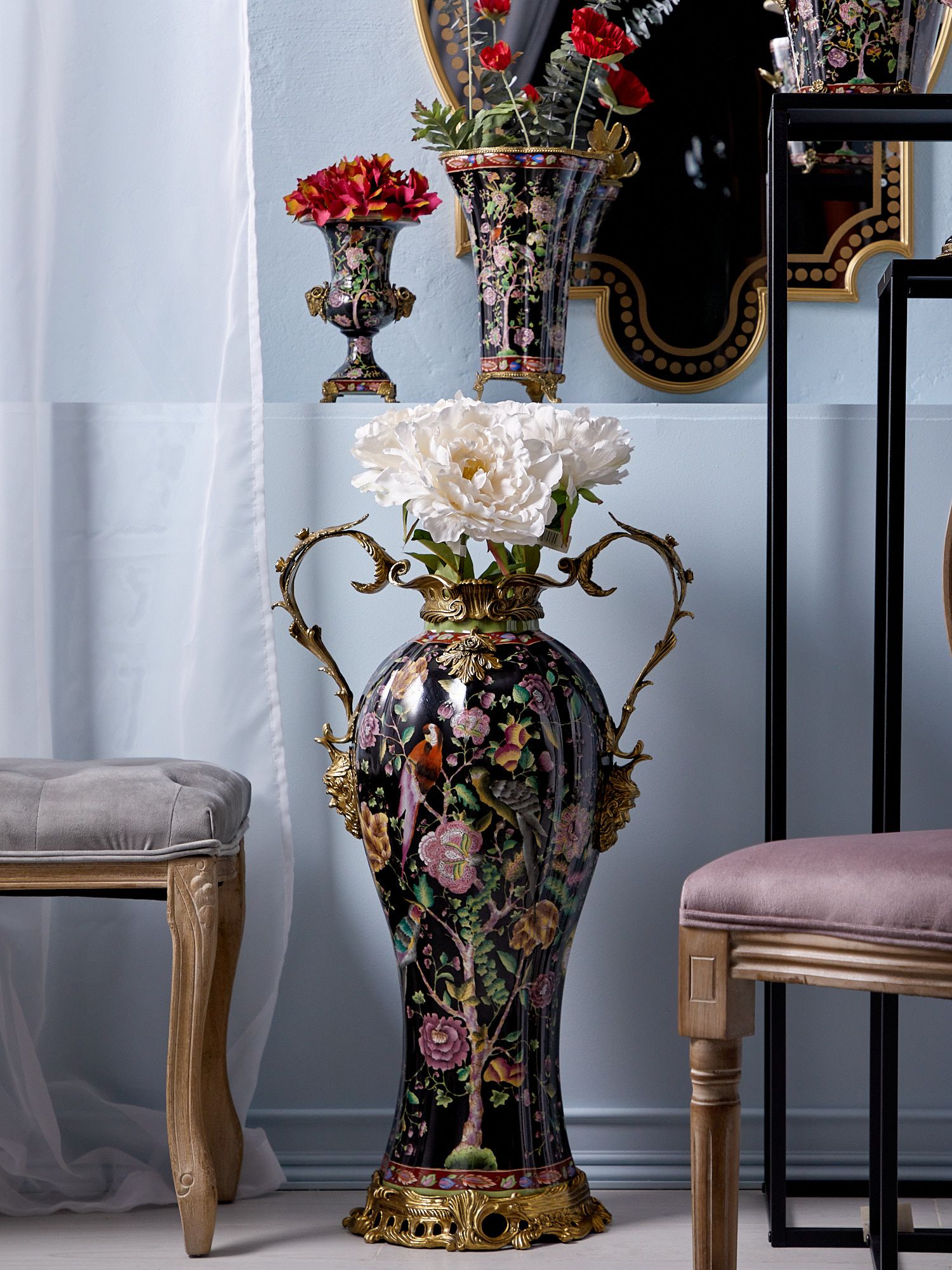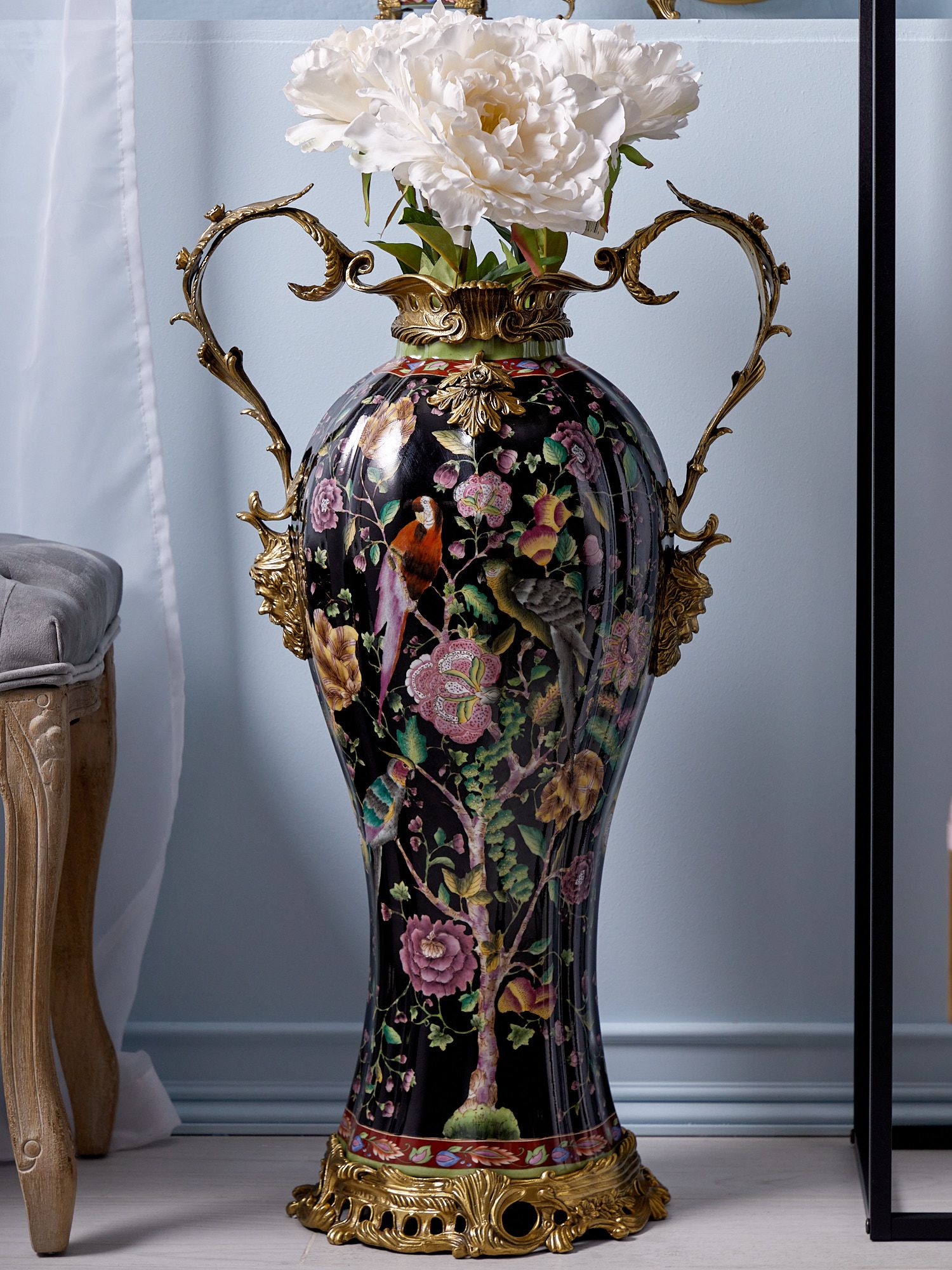 Ваза с ручками, выполненная из фарфора с бронзовыми элементами. Уникальное изделие ручной работы. При производстве этих художественных изделий из фарфора с бронзой используются вековые традиции китайских мастеров. Видимые трещинки (кракелюры) делаются по уникальной технологии, что придает более благородный вид старинного изделия.