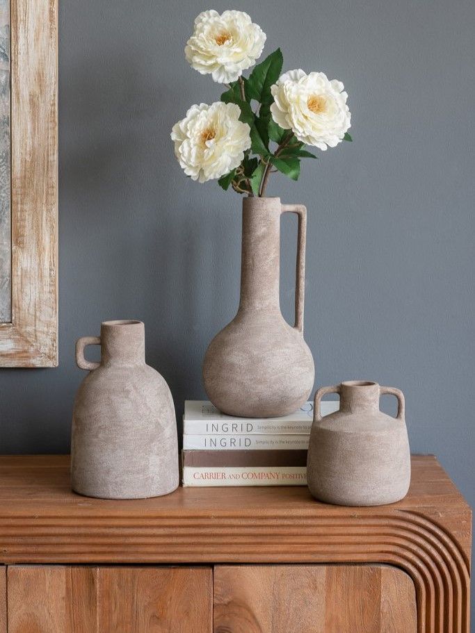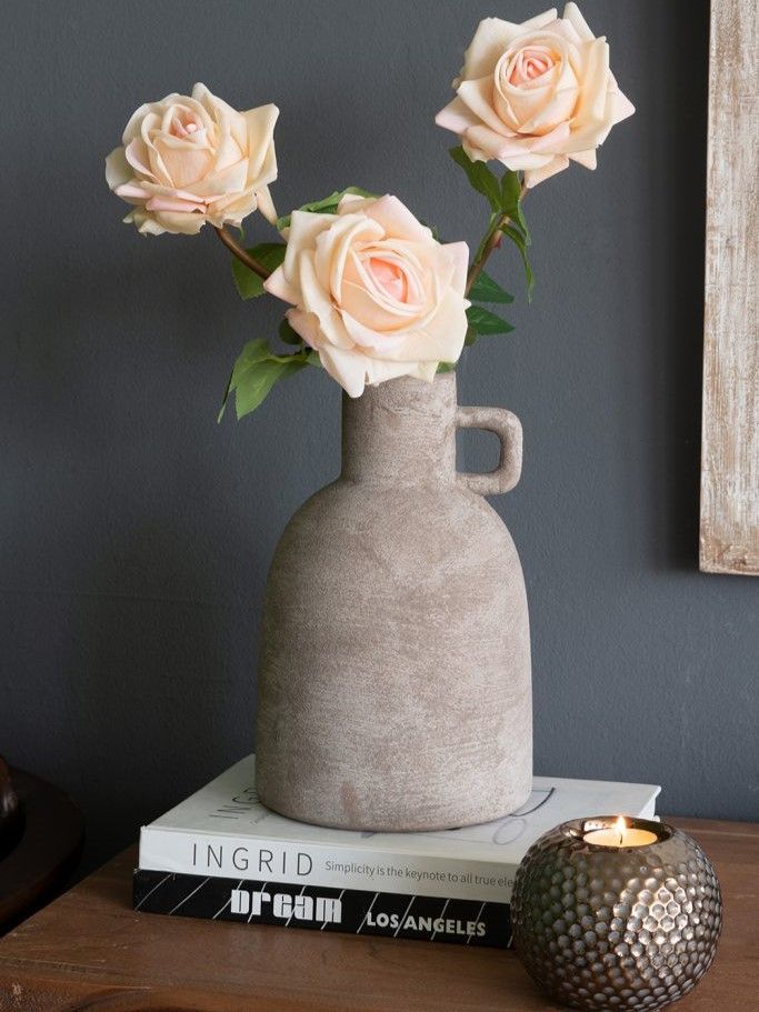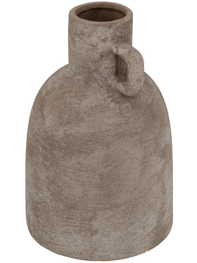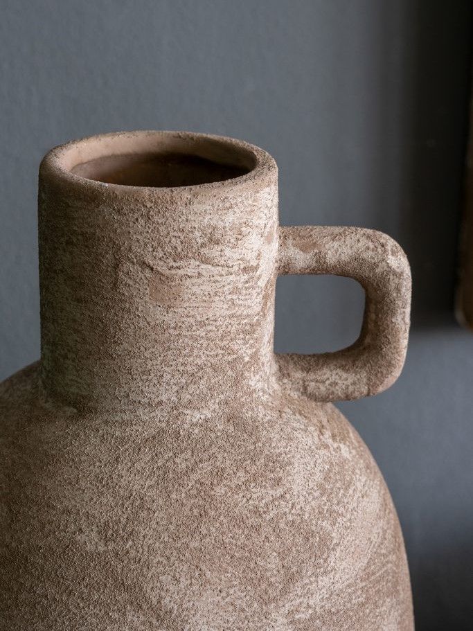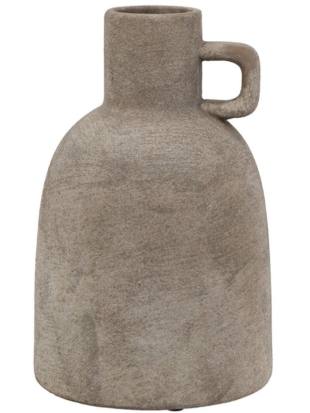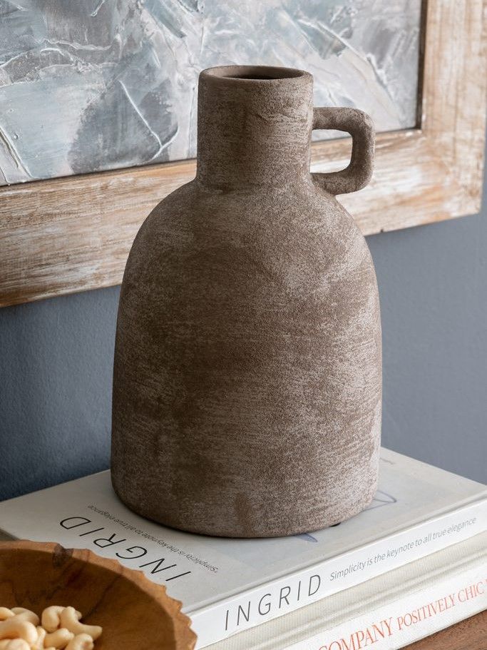 Керамическая ваза с ручкой, дизайн которой вдохновлен красотой старинных кувшинов для воды, имеет классический скульптурный силуэт, узкое горлышко и матовую серую поверхность. Независимо от того, стоит ли она сама по себе или в сочетании с яркими цветами, она придаст вашему интерьеру нотку природного очарования. Благодаря приглушенной цветовой гамме и ручной работе, ваза дополнит переходный, современный и ваби-саби стили, органично вписываясь в любой интерьер.