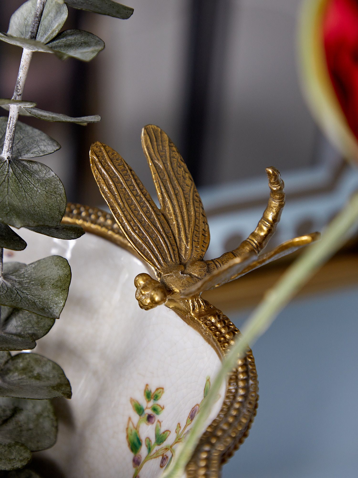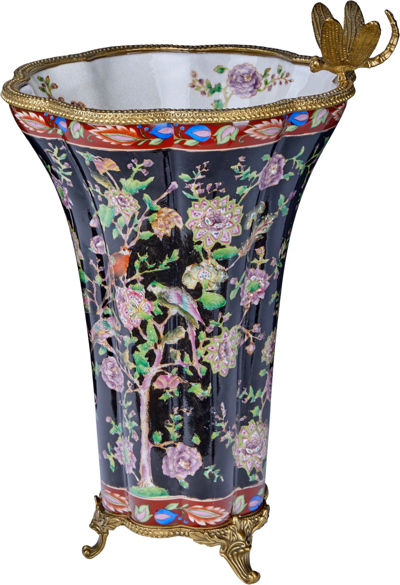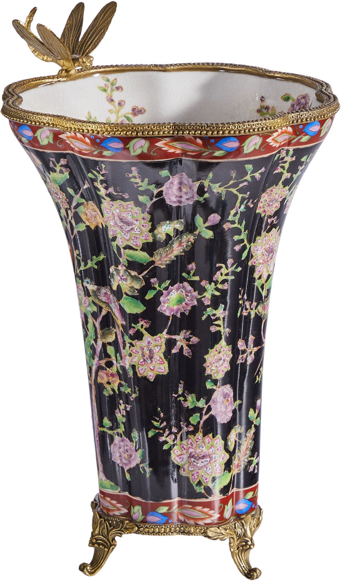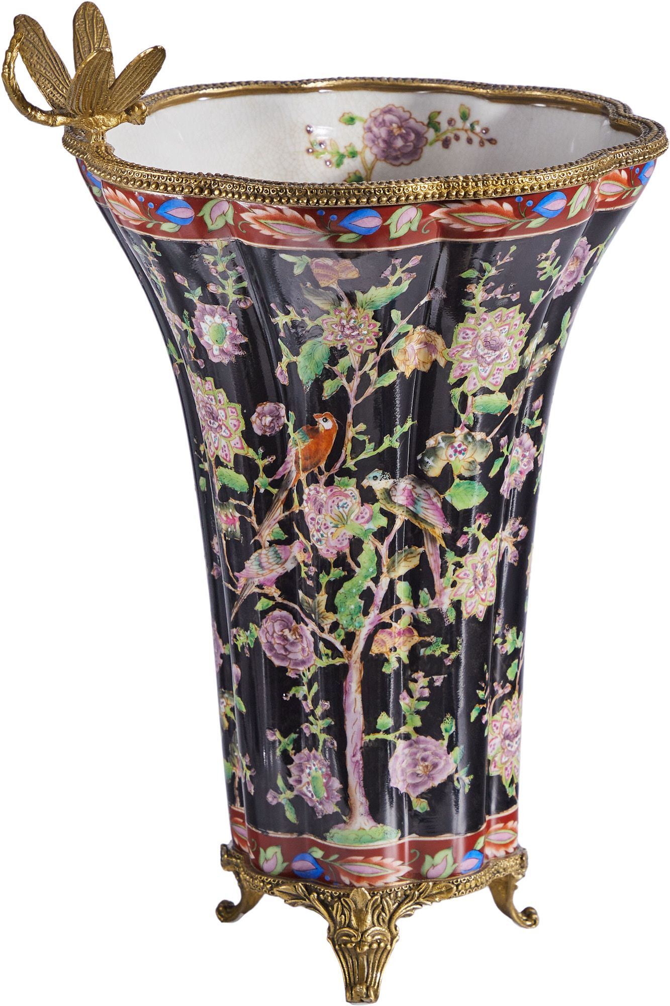 Ваза со стрекозой, выполненная из фарфора с бронзовыми элементами. Уникальное изделие ручной работы. При производстве этих художественных изделий из фарфора с бронзой используются вековые традиции китайских мастеров. Видимые трещинки (кракелюры) делаются по уникальной технологии, что придает более благородный вид старинного изделия.
