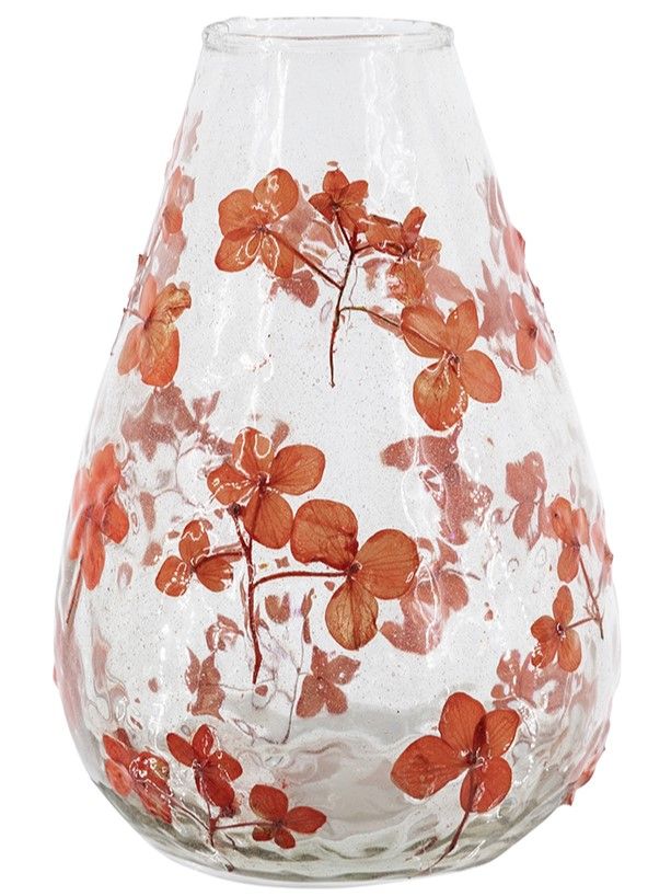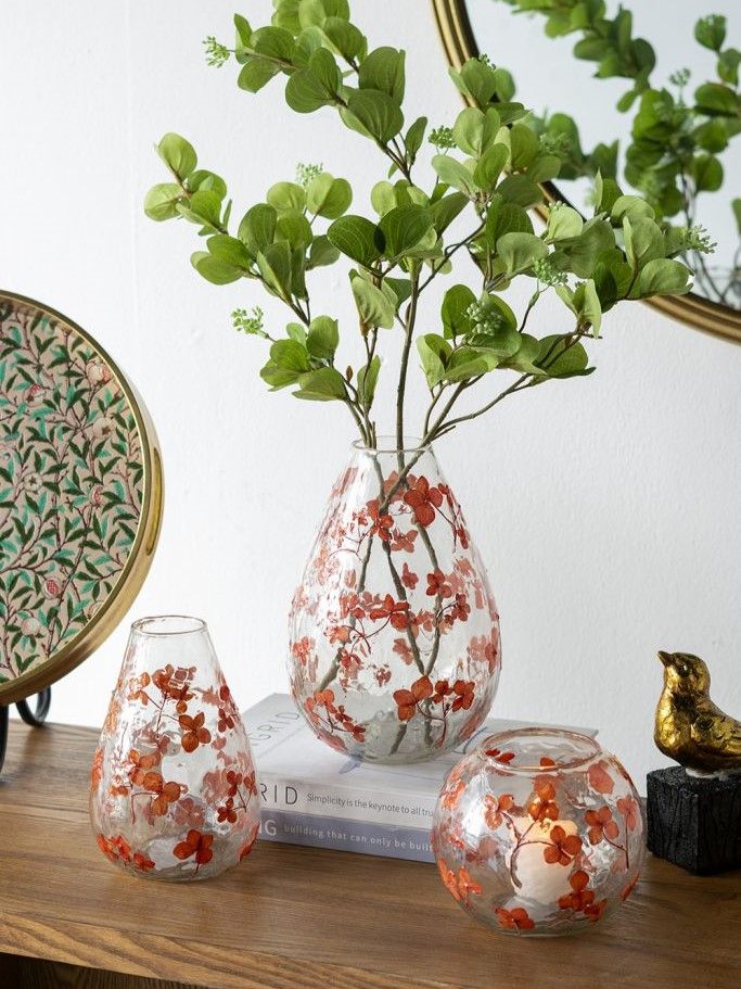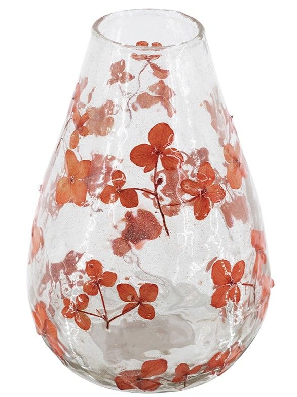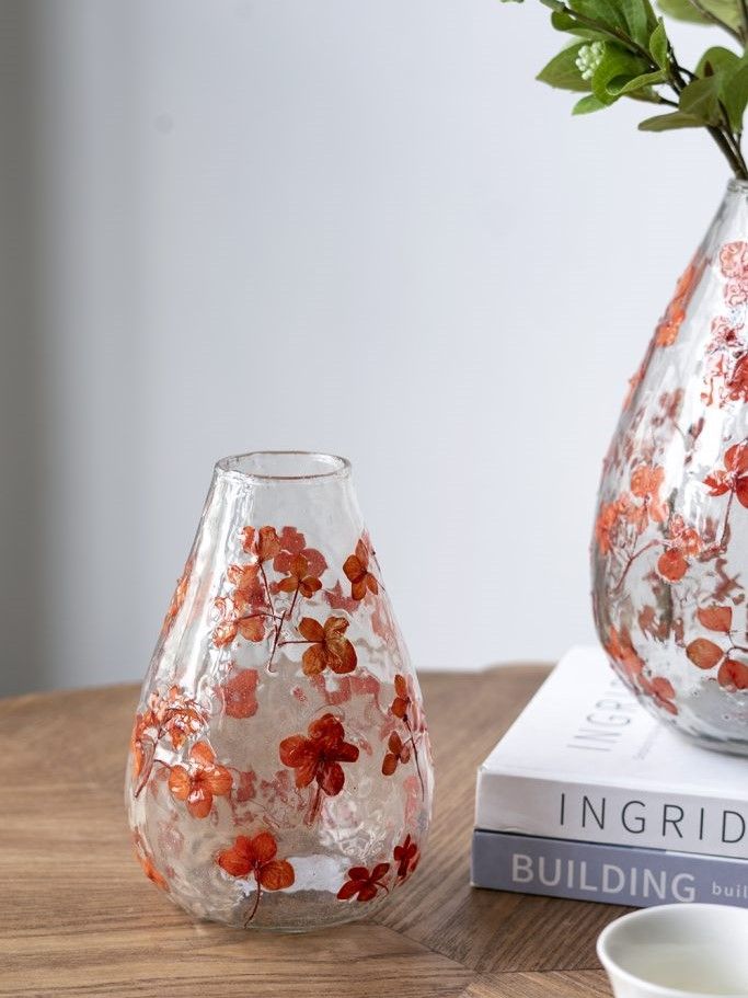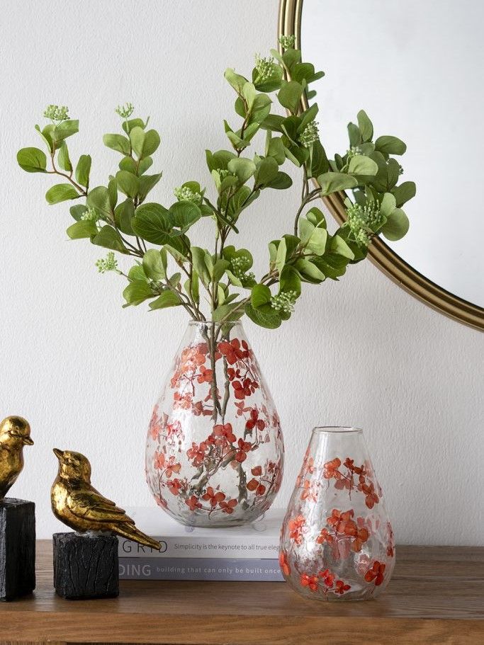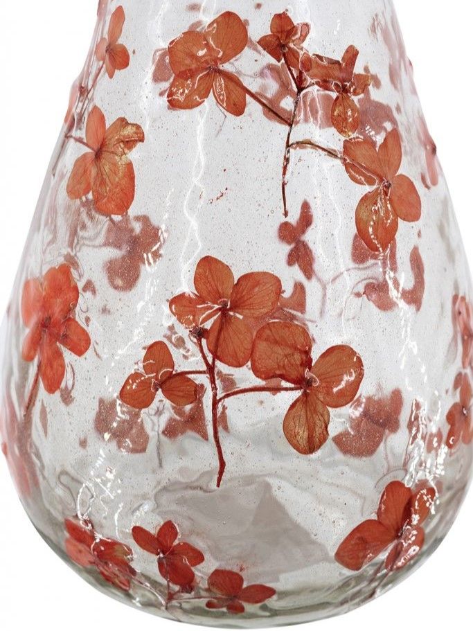 Стекляная ваза, сочетающая в себе классический дизайн и беззаботную красоту природы, имеет округлый силуэт, абсолютно прозрачный оттенок и ярко-красные цветочные узоры. Независимо от того, стоит ли она пустая или наполненная вашими любимыми цветами, она идеально впишется в любой интерьер на столе, каминной полке или консоли, гармонично сочетаясь с традиционными, богемными, эклектичными и современными стилями.