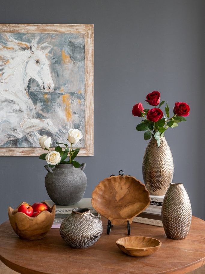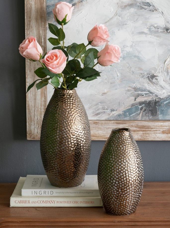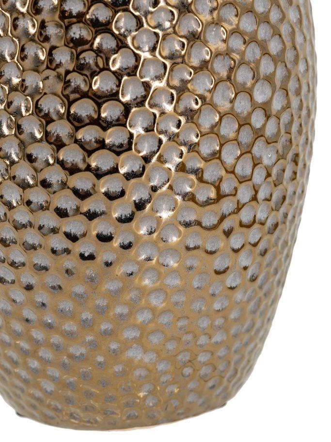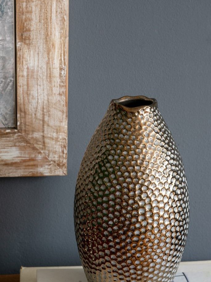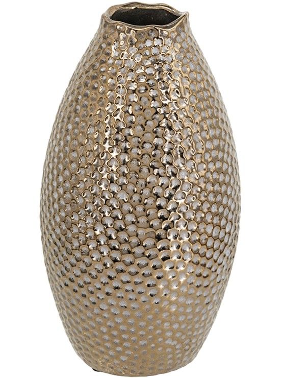 Эффектная керамическая ваза с классическим силуэтом, текстурным корпусом в виде пчелиных сот и винтажной бронзовой отделкой. Разместите изделие на вашем просторном журнальном столике, каминной полке или создайте свой дизайн интерьера совместно с изделиями из этой коллекции. Металлический блеск и привлекательная форма, выполненная вручную, позволяют этой вазе дополнять переходный, современный, индустриальный и другие стили, органично вписываясь в любой интерьер.