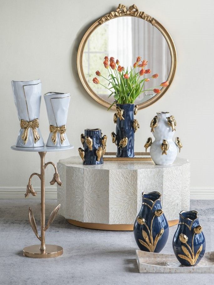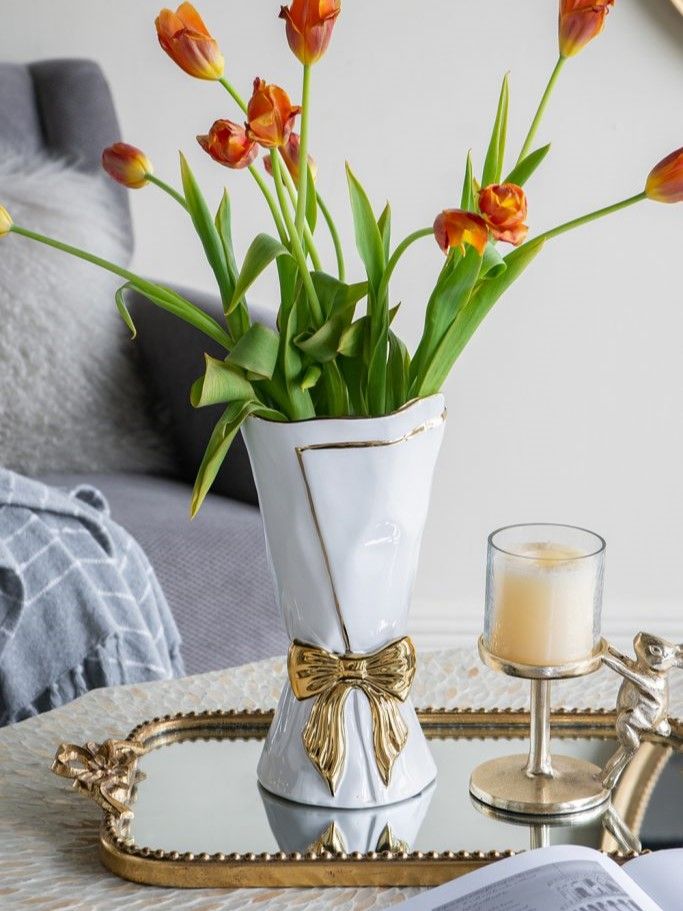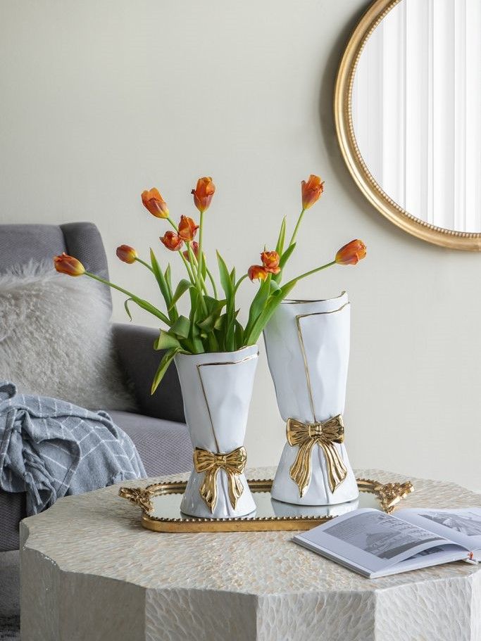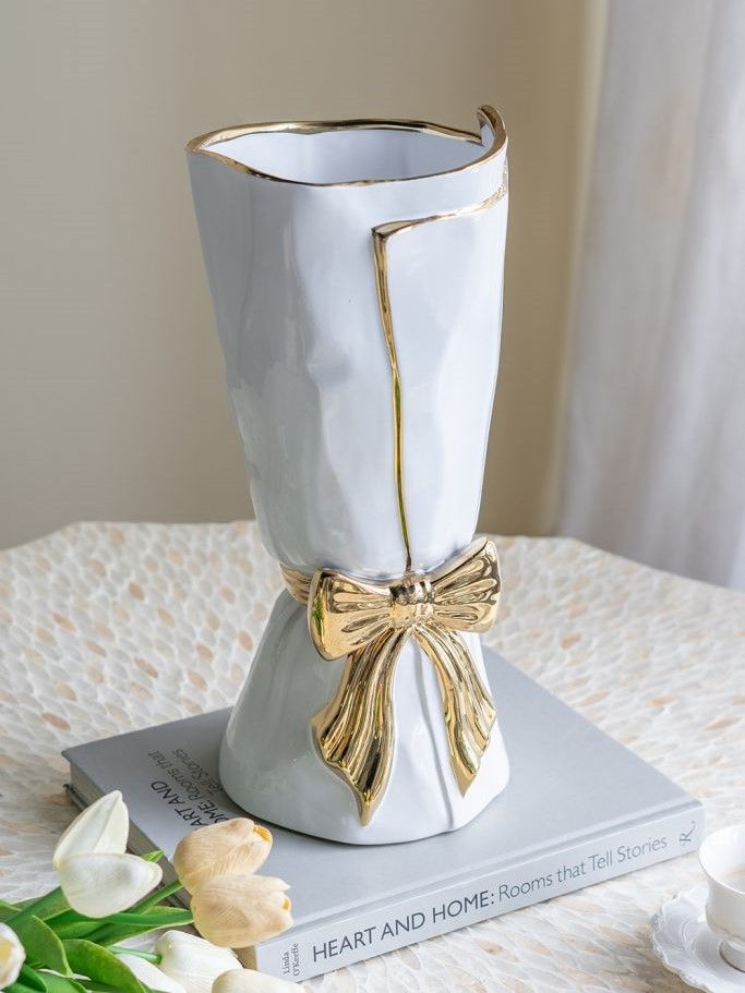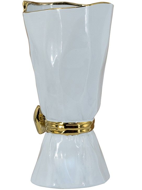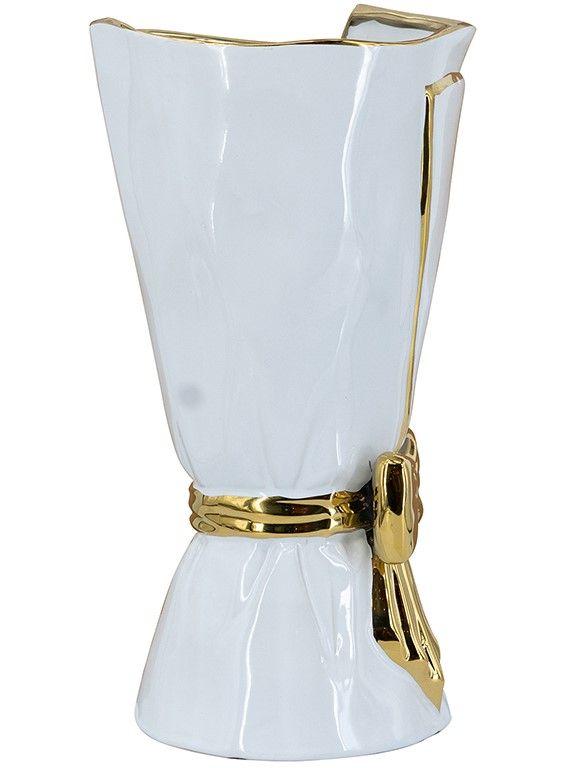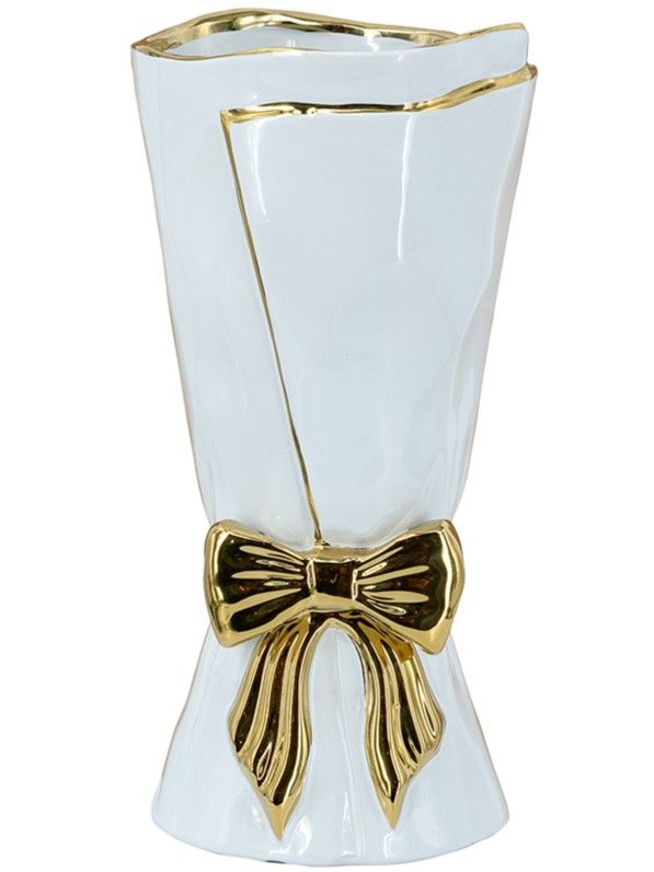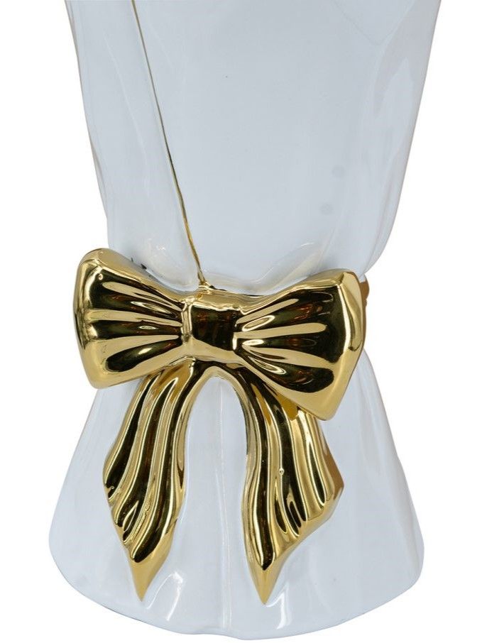Элегантная ваза в виде царского свитка, сочетающая в себе современную роскошь и легкий романтический штрих, обладает белоснежной поверхностью с богато украшенным золотым бантом. Независимо от того, стоит ли ваза отдельно, или совместно с пышной цветочной композицией, однозначно привлечет внимание на любом столе, каминной полке или консоли. Контрастная двухцветная гамма позволяет этому изделию сочетаться с современным стилем, арт-деко, французским провансом и другой тематикой, гармонично вписываясь в любой интерьер.