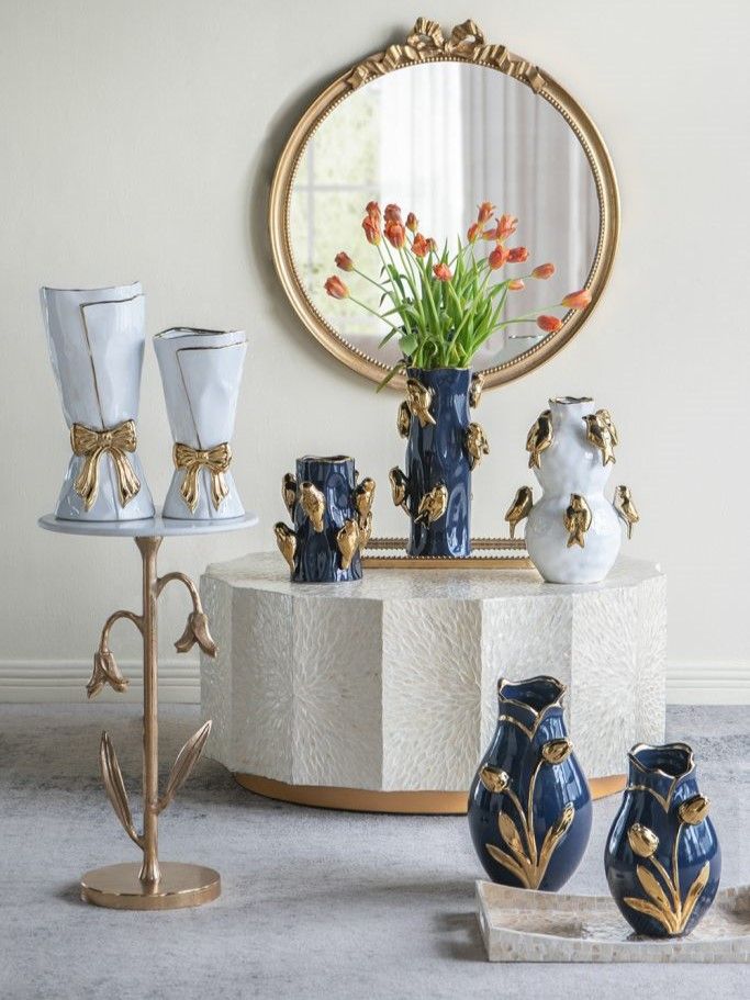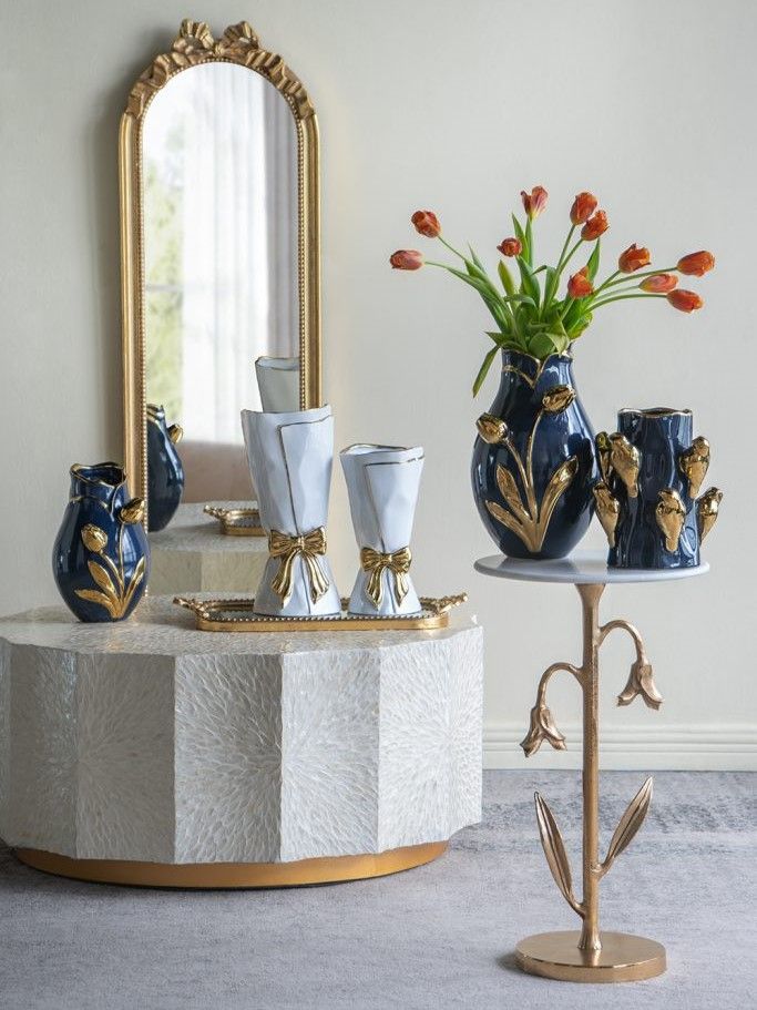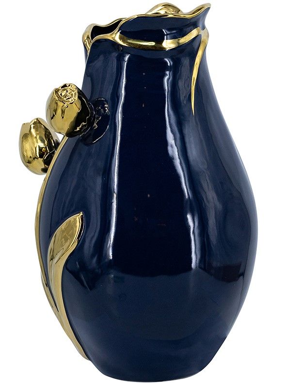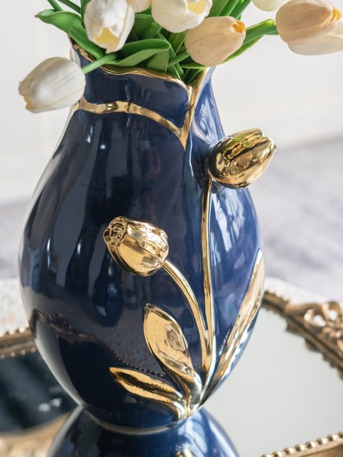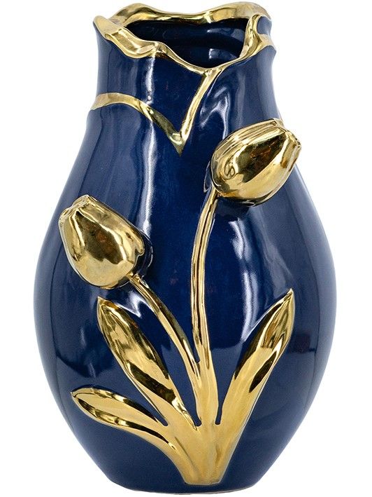 Декоративная ваза, сочетающая в себе утонченную красоту природы и плавные линии, имеет округлый силуэт, темно-синюю отделку и фактурный узор в виде золотых тюльпанов. Разместите изделие на вашем журнальном столике, каминной полке или создайте свой дизайн интерьера совместно с изделиями из этой коллекции. Насыщенная двухцветная расцветка позволяет этой вазе гармонично сочетаться с современным стилем, арт-деко, традиционными и гламурными мотивами, органично вписываясь в любой интерьер