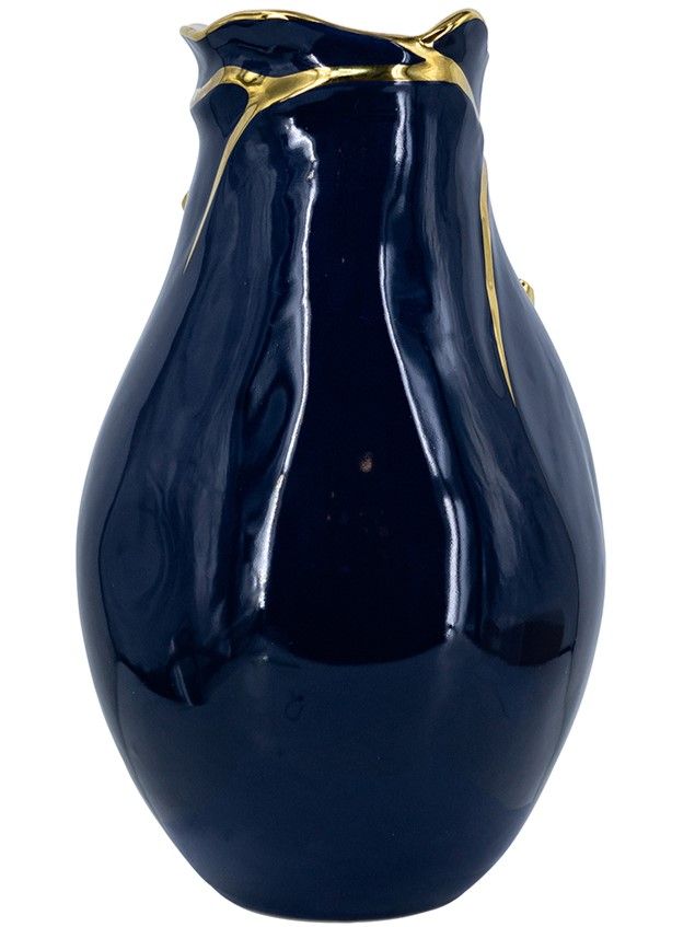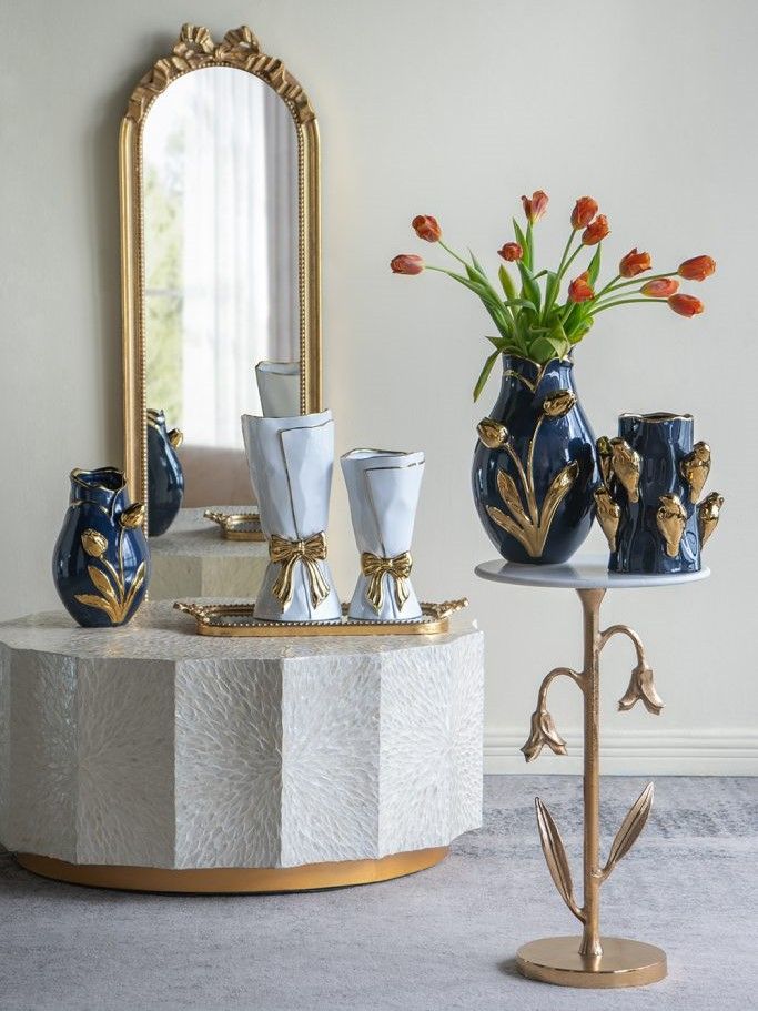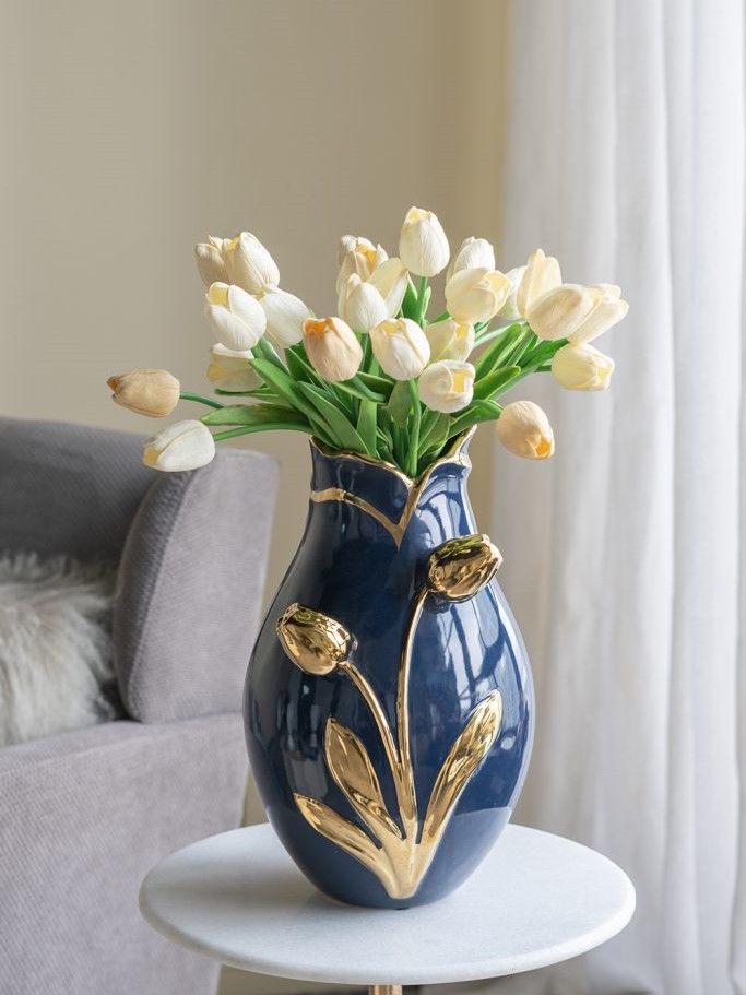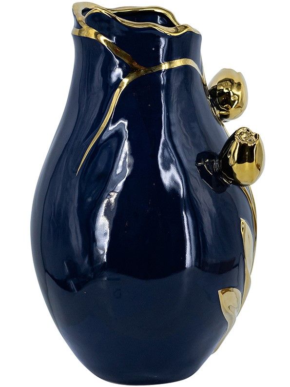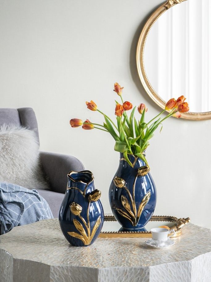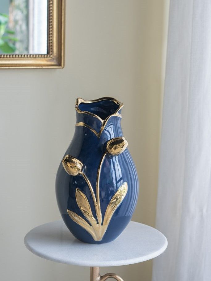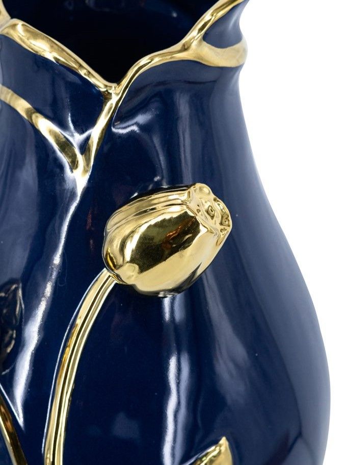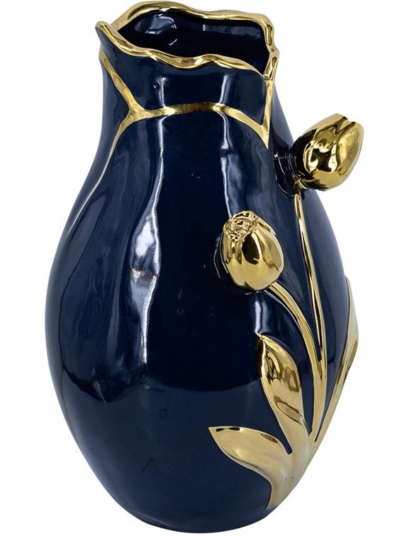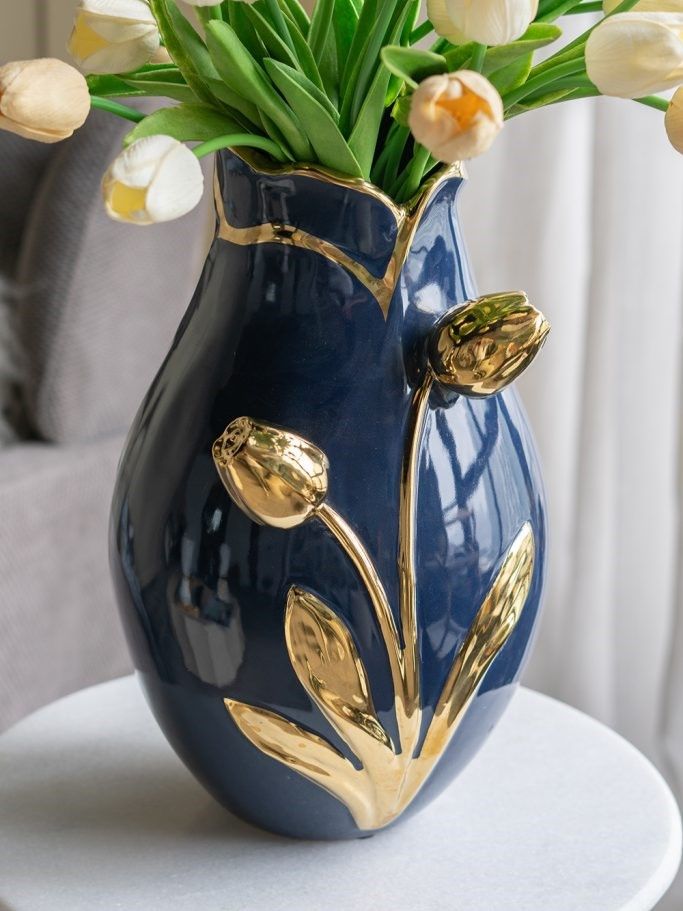 Декоративная ваза, сочетающая в себе утонченную красоту природы и плавные линии, имеет округлый силуэт, темно-синюю отделку и фактурный узор в виде золотых тюльпанов. Разместите изделие на вашем журнальном столике, каминной полке или создайте свой дизайн интерьера совместно с изделиями из этой коллекции. Насыщенная двухцветная расцветка позволяет этой вазе гармонично сочетаться с современным стилем, арт-деко, традиционными и гламурными мотивами, органично вписываясь в любой интерьер