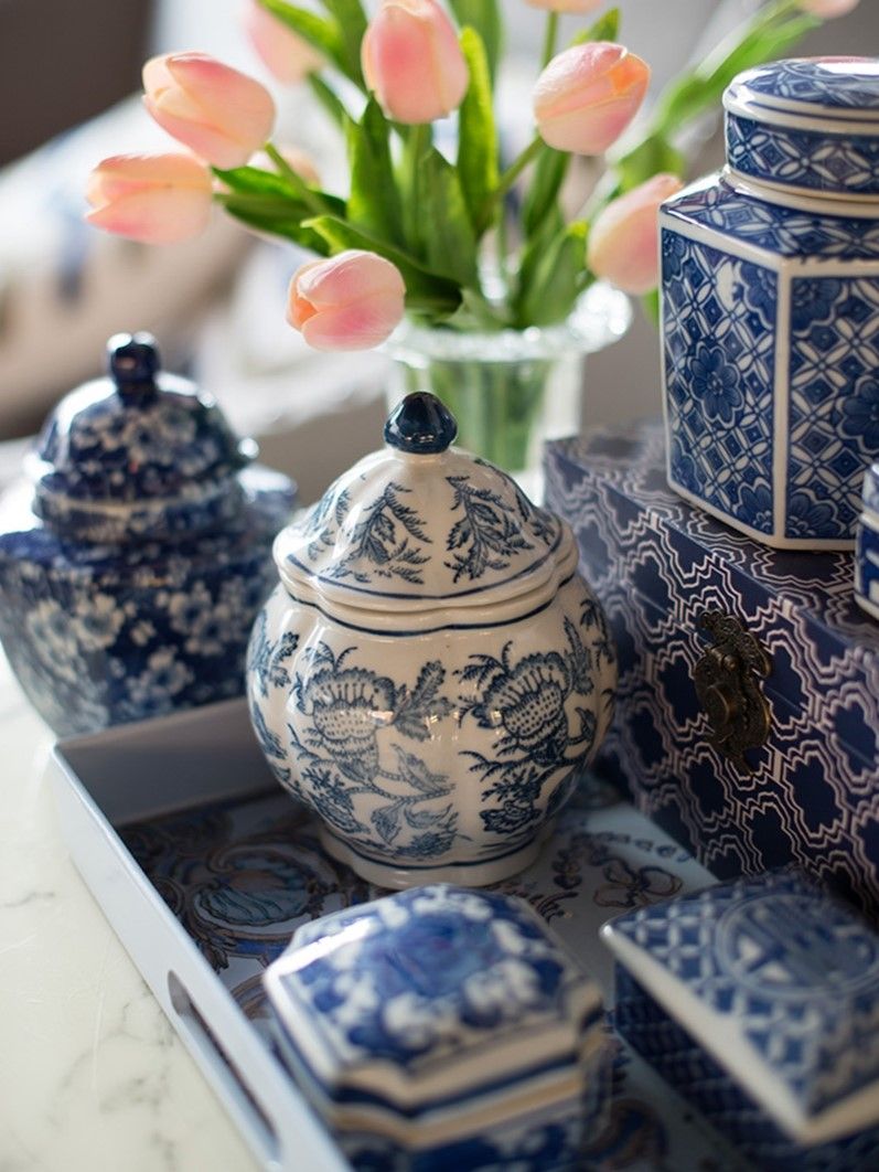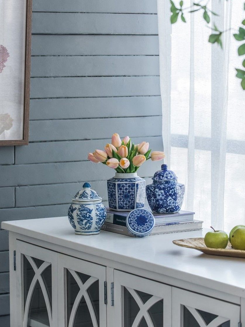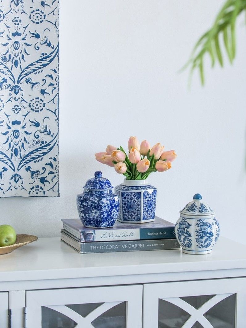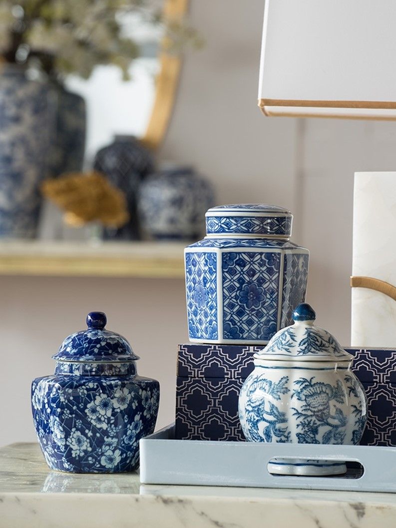 Набор декоративных ваз включает в себя множество стилистических влияний, и это полезный способ начать новую тематическую коллекцию. Все три изделия изготовлены из гладкого фарфора с белой глазурью, но каждый имеет свою отличительную форму и яркий синий узор.