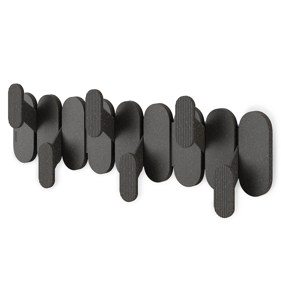 "Настенная вешалка Tempo органично сочетает в себе актуальный дизайн и функциональность. Шесть крючков, расположенных в шахматном порядке, создают на стене выразительный графический акцент. Изделие изготовлено из переработанного пластика с добавлением древесного волокна. Прочная конструкция выдерживает значительные нагрузки.