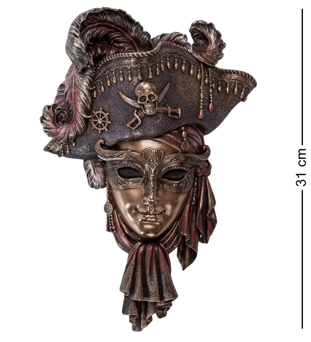 К счастью, в наше время шансы встретить пирата не выше, чем оказаться под метеоритным дождем, но интерес к давно прошедшим временам не ослабевает, и многие дети мечтают пожить под флагом Веселого Роджера. Маска сделана из темного полистоуна, цвет которого напоминает покрытую патиной бронзу. Верх маски выполнен в виде пиратской треуголки, украшенной перьями, черепом с костями и миниатюрным корабельным штурвалом.