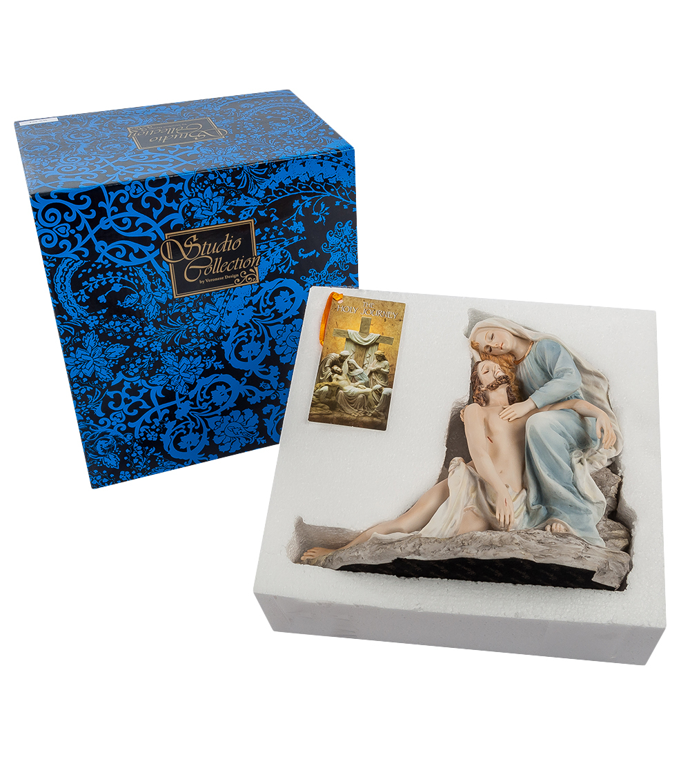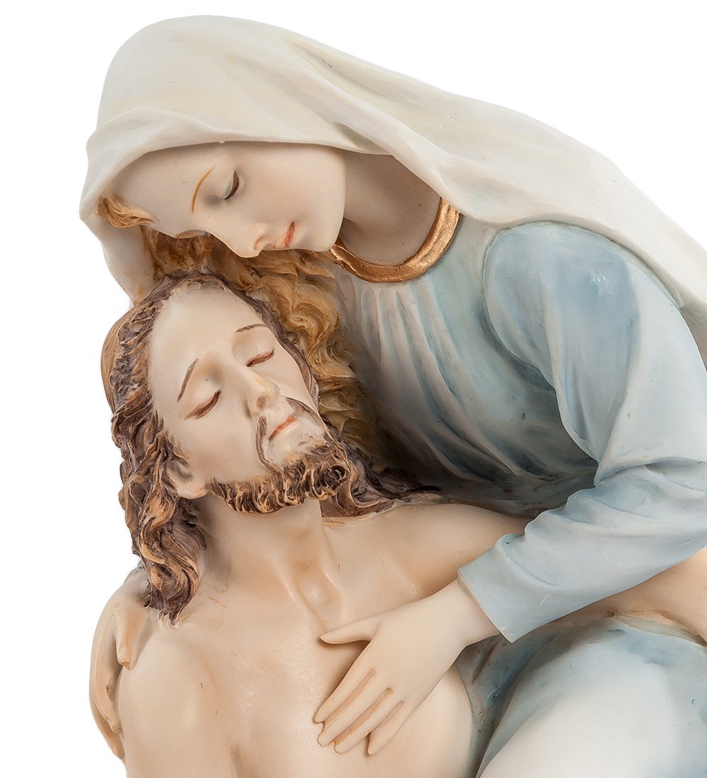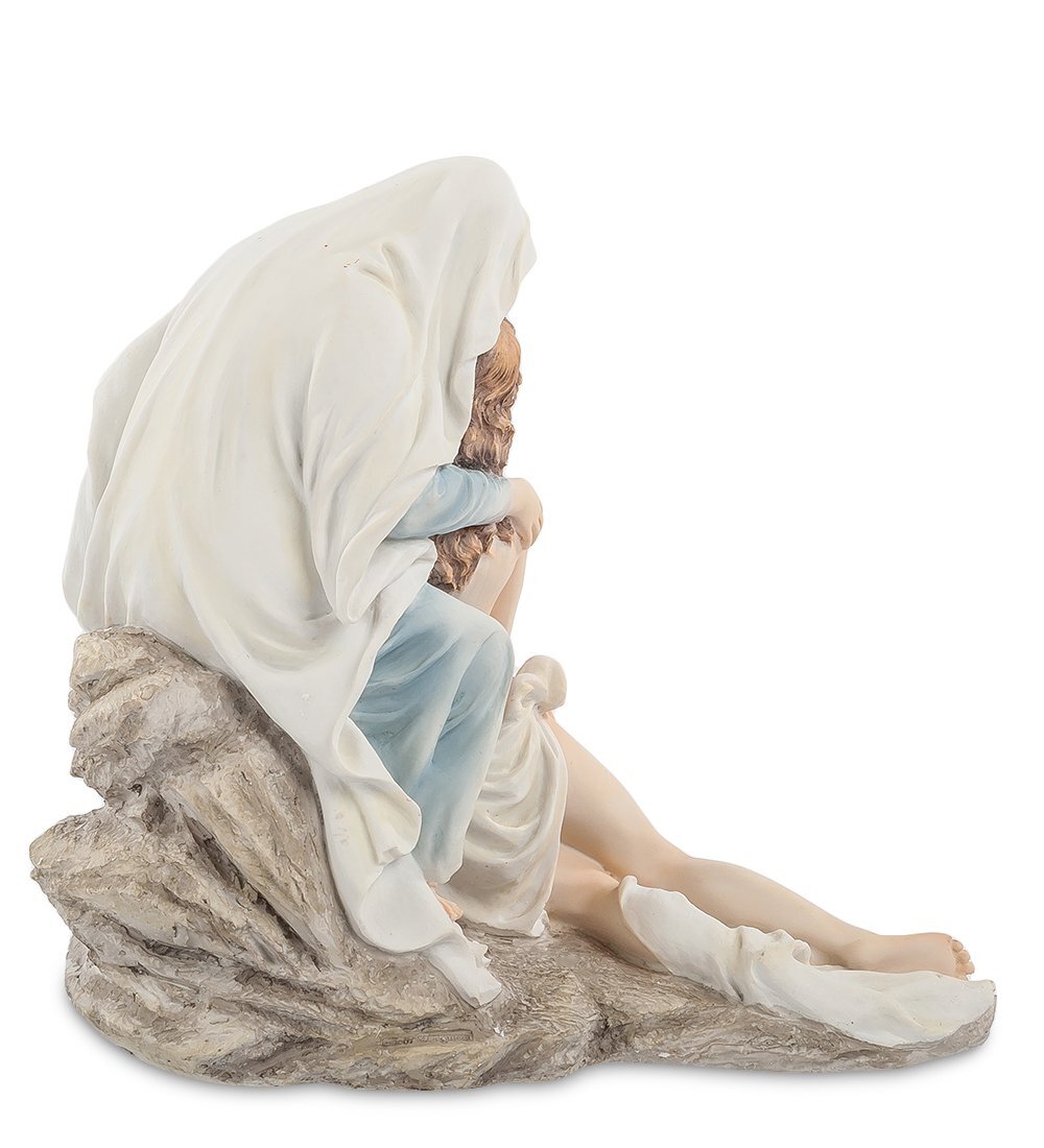 Спасителя освободили, Богородица держала сына на руках и печалилась над телом дорогого и любимого человека. Он стал жертвой ради спасения людей и выстрадал все грехи. Фигурка Пьета выполнена из полистоуна и окрашена в разные тона. Фигуры выглядят, как единое целое, они реалистичны. Автор постарался передать всю суть происходящего события.