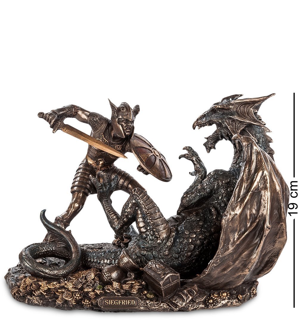 Статуэтка «Зигфрид, побеждающий Дракона» демонстрирует эпизод победы героя «Песни о Нибелунгах» Зигфрида над драконом Фанфиром. Согласно легенде, после победы Зигфрид искупался в крови побежденного чудовища и стал неуязвим, однако небольшой участок кожи, на котором прилип липовый листок, кровь дракона не коснулась. После победы и купания в драконьей крови Зигфрид много путешествовал и совершил немало подвигов.