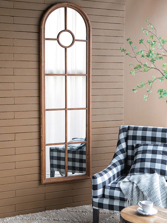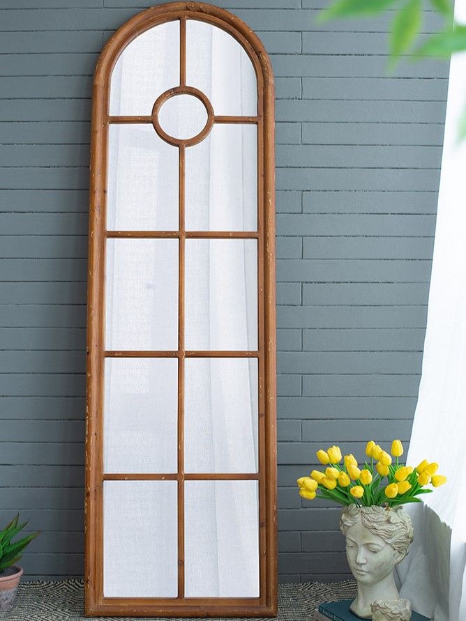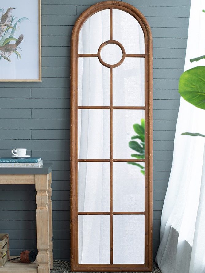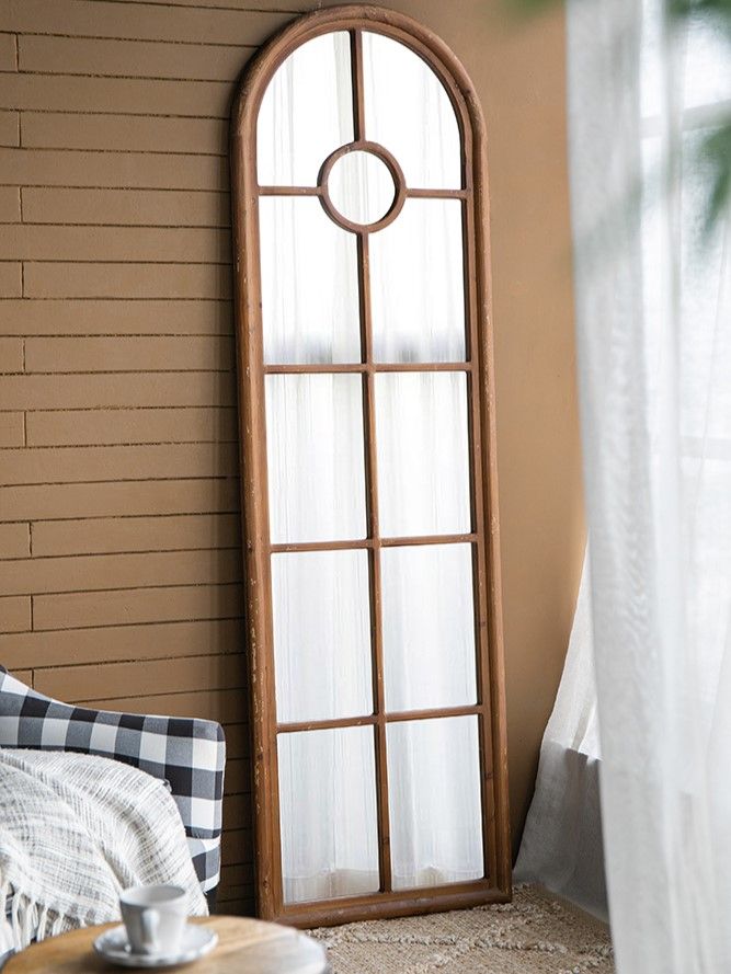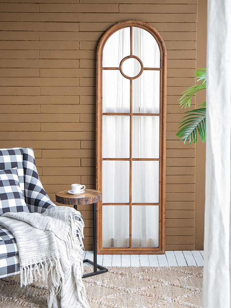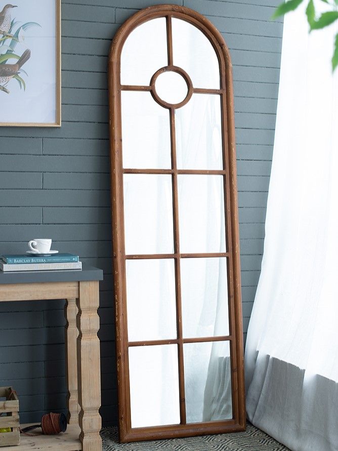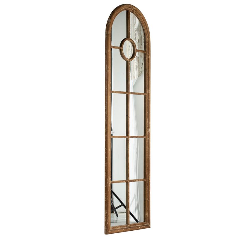 Зеркало напольное, облицованное панелями и напоминающее декоративное окно, позволяет интегрировать классическую архитектуру в повседневный интерьер. Рама выполнена из массива ели с эффектом под старину, что придает ей рустикальный вид.
