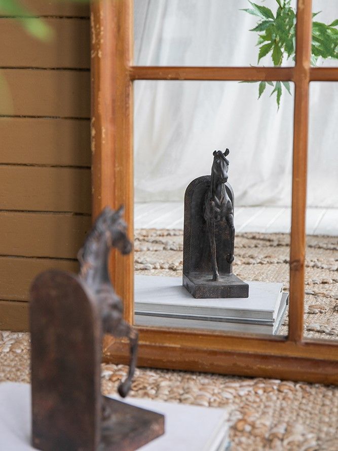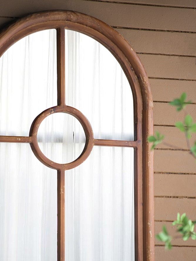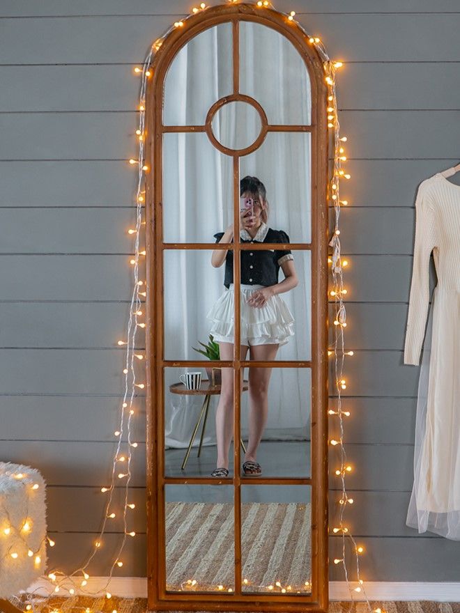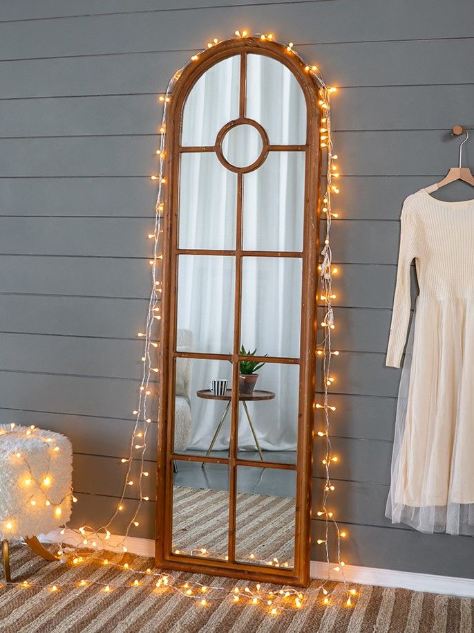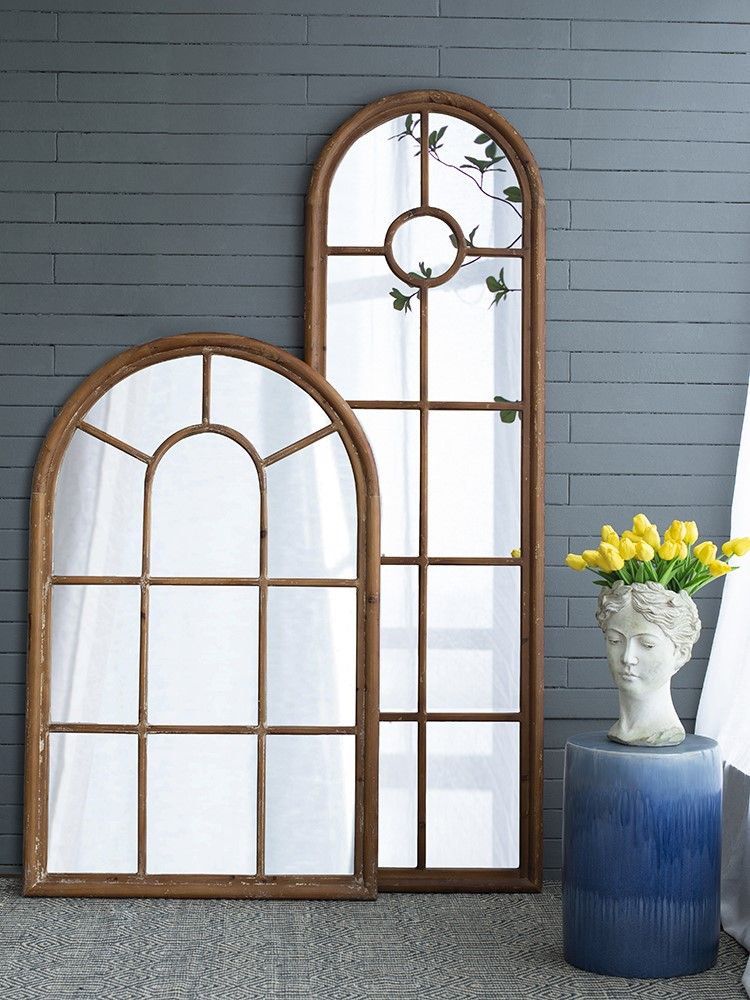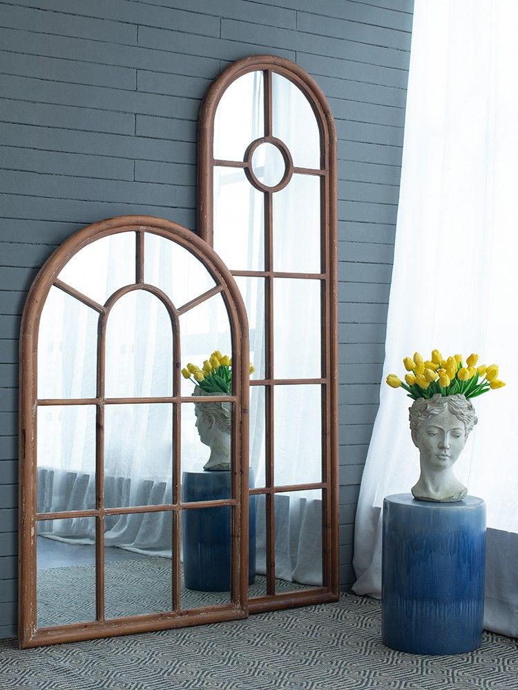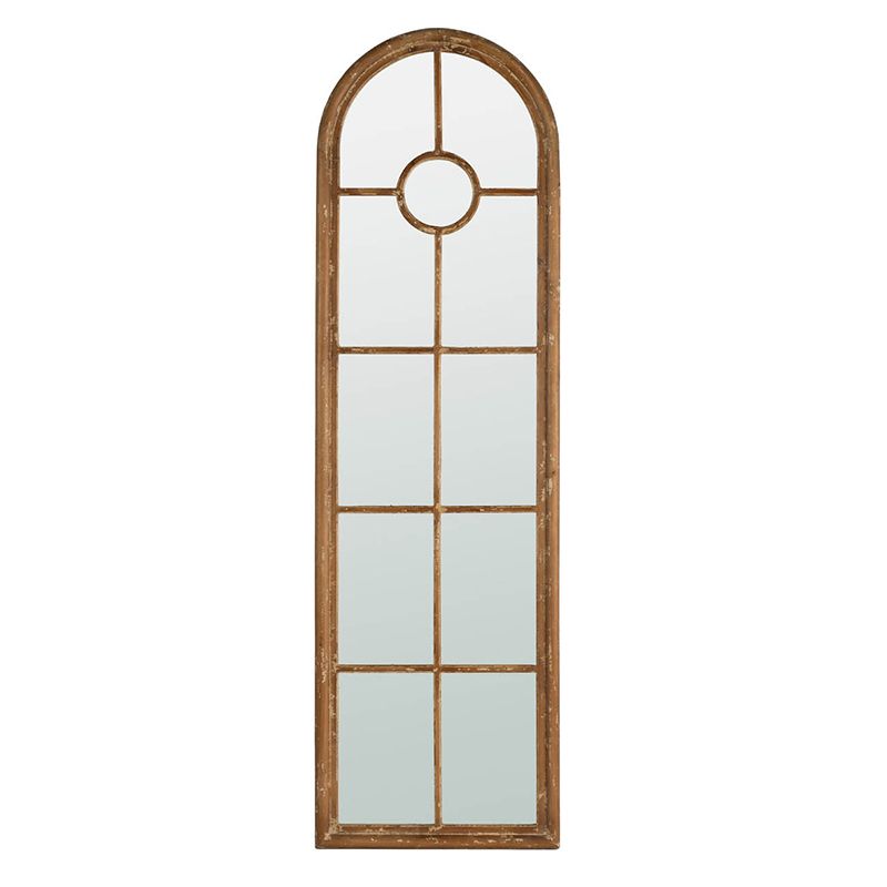 Зеркало напольное, облицованное панелями и напоминающее декоративное окно, позволяет интегрировать классическую архитектуру в повседневный интерьер. Рама выполнена из массива ели с эффектом под старину, что придает ей рустикальный вид.