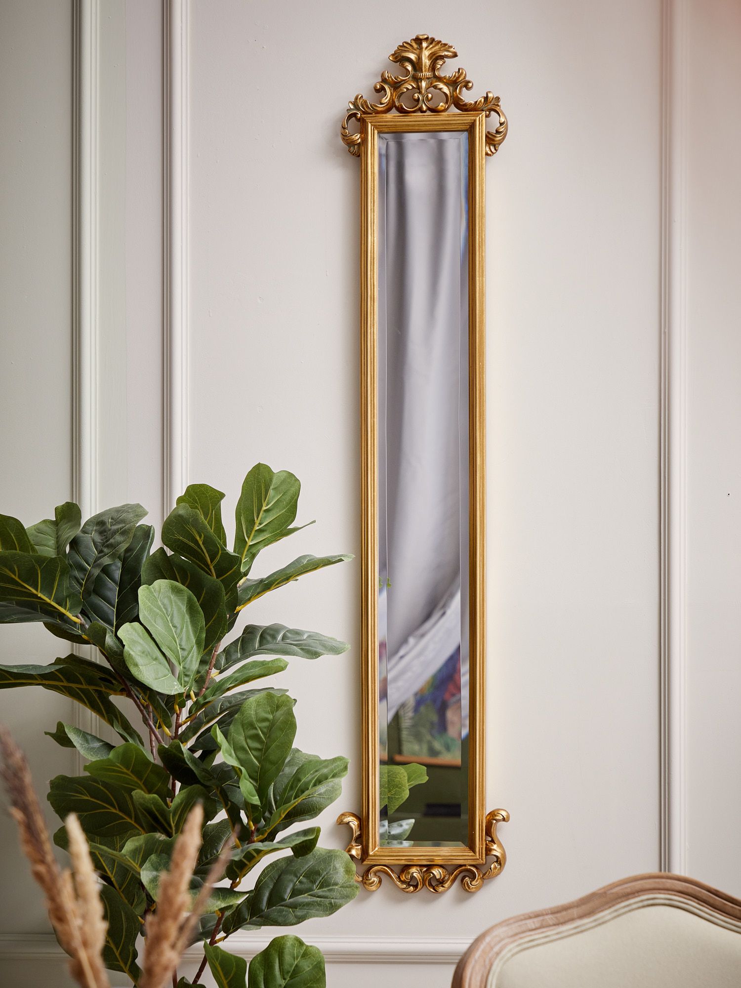 Настенное зеркало в дворцовом стиле, украшенное фацетом и багетом золотистого цвета. Это изделие без сомнений займет центральное место и подчеркнет красоту вашей гостиной или спальной комнаты. Подчеркните изысканность своей комнаты, размещая два зеркала на одной стене.