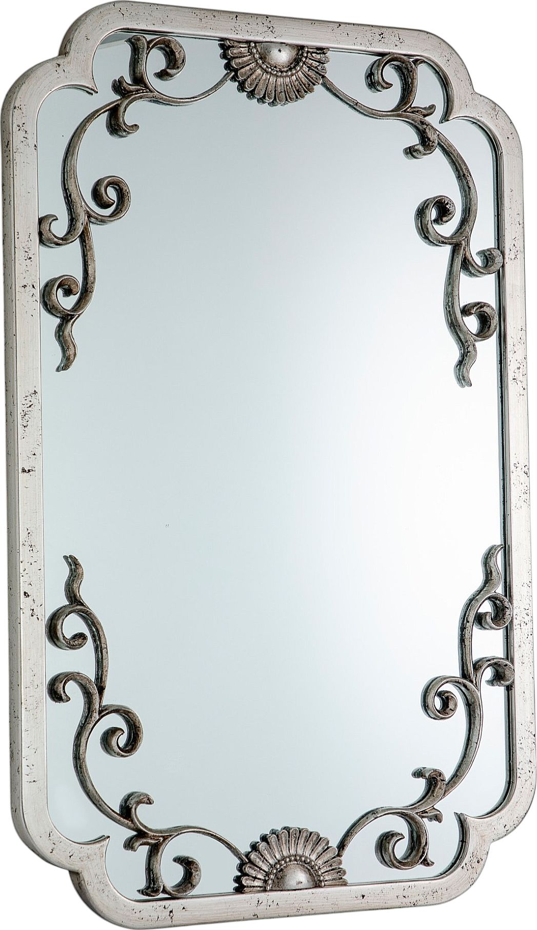 Настенное зеркало, украшенное багетом серебристого цвета с цветочным орнаментом. Это изделие без сомнений займет центральное место и подчеркнет красоту вашей гостиной или спальной комнаты.