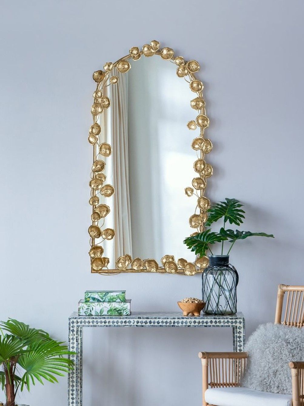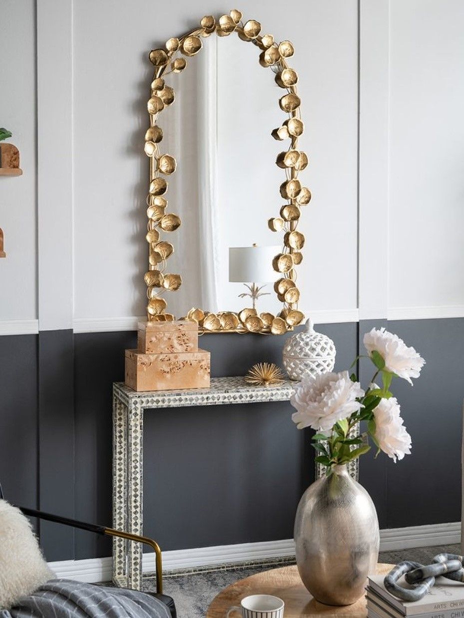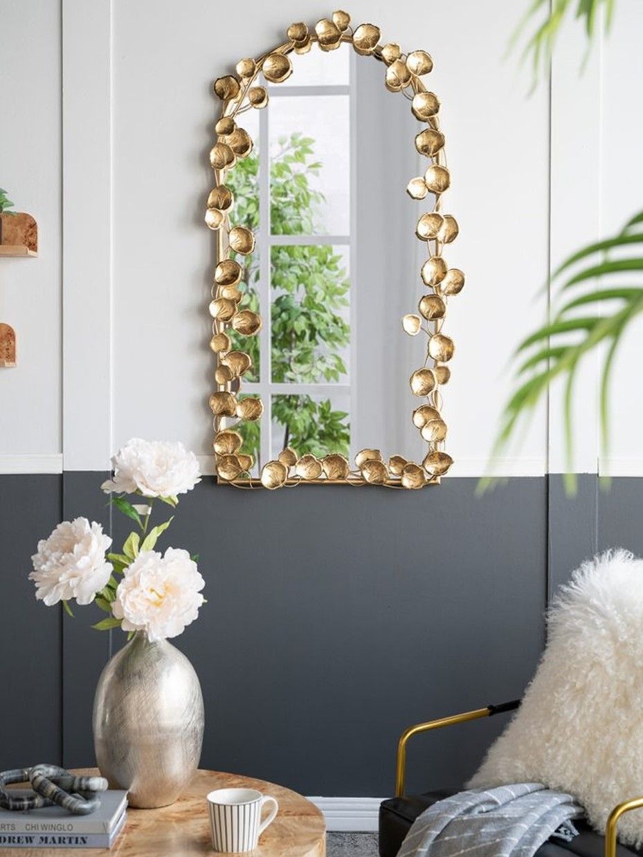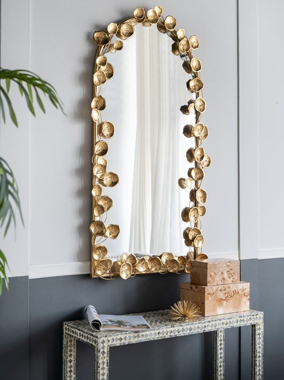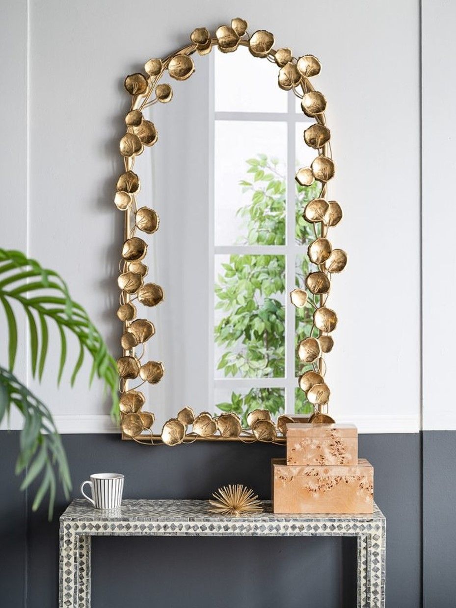 Неподражаемое настенное зеркало с обрамлением в виде листков лотоса, украсит современный интерьер вашего дома и воплотит дизайнерские мечты. Повесьте изделие в прихожей, просторной гостиной или над консольным столиком, чтобы придать современный вид вашему жилому пространству.