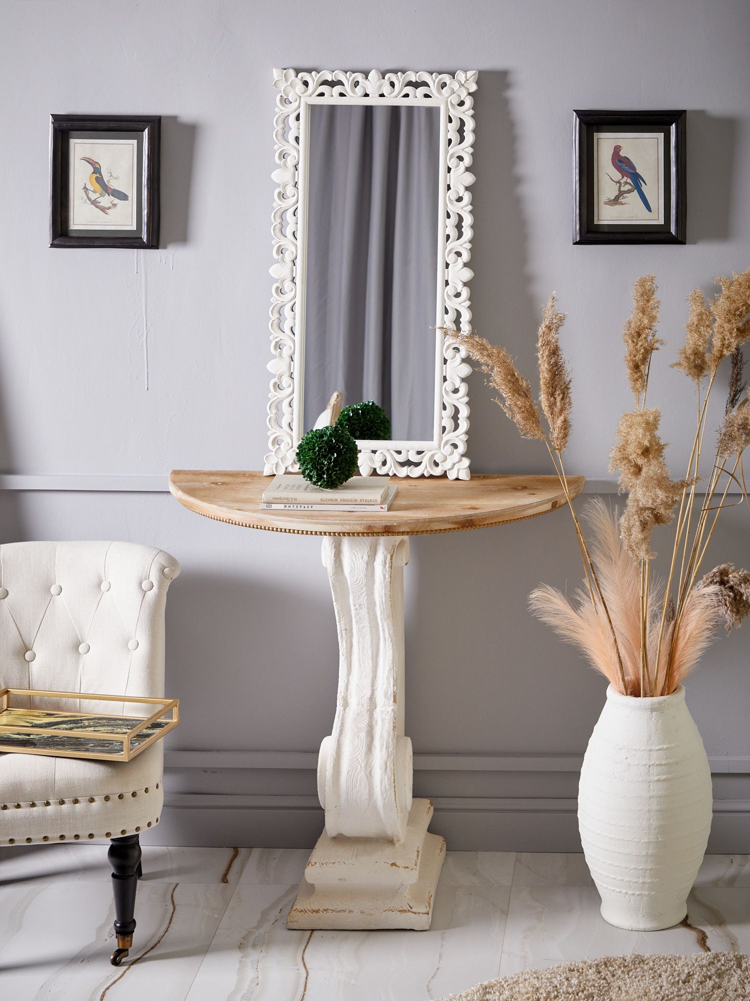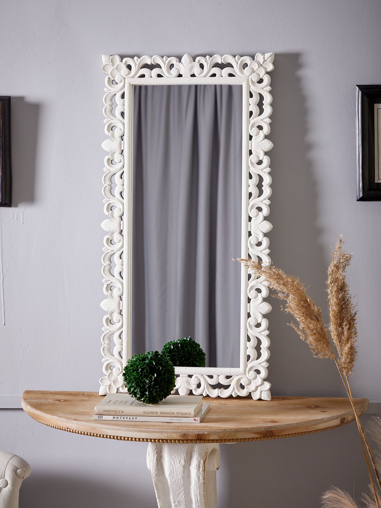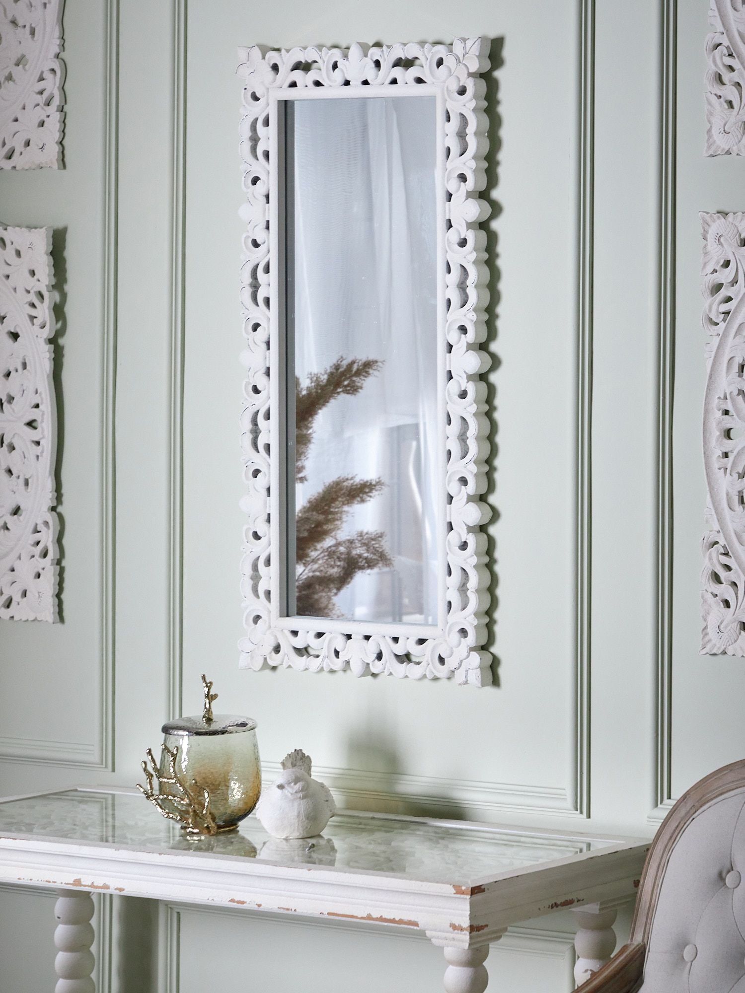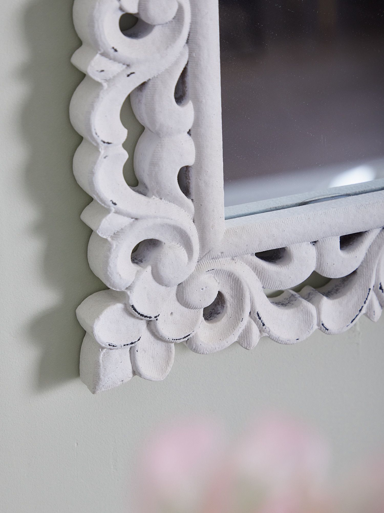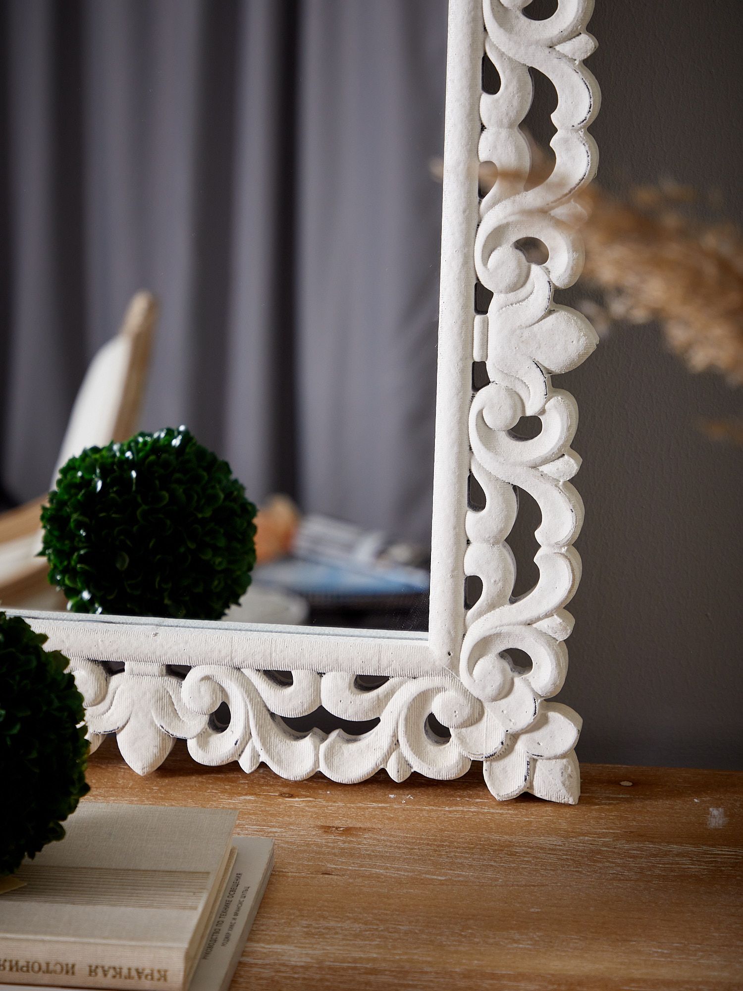 Изысканное настенное зеркало с роскошной ажурной рамой и антикварной отделкой, создаст неподражаемый эффект в любом помещении. На раме зеркала установлены три крепления для горизонтального и вертикального подвешивания. Элегантный внешний вид, неподвластный времени, идеально подходит для интерьера вашего дома. Украсьте стены этим изделием в шикарной гостиной, прихожей или спальной комнате. Поверхностные потертости и неровности с эффектом реставрации, трещины и сколы краски на изделии характеризуют индивидуальный подход к производству каждого предмета, создавая задуманный дизайнером античный образ ушедших эпох.