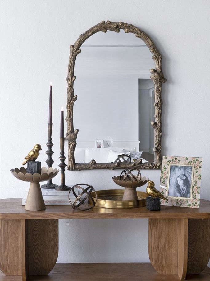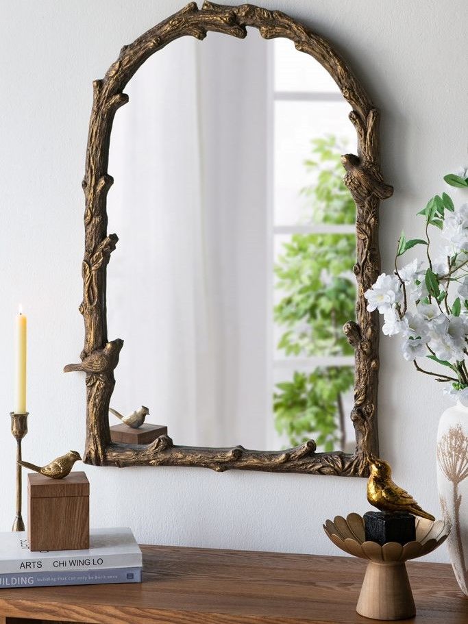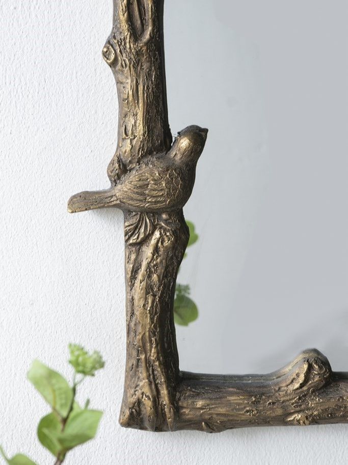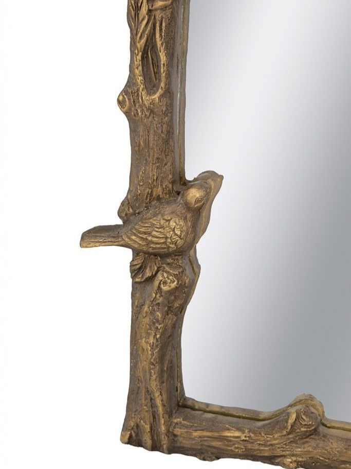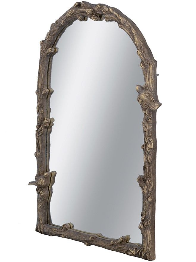 Акцентное зеркало представляет собой роскошную красоту винтажного искусства в сочетании с лесной природой. Имеет изогнутый арочный силуэт, покрытие под античное золото и красивую растительную раму, украшенную изящными птицами. Высококачественное стекло не только обеспечивает кристально чистое отражение, но и усиливает естественное освещение, благодаря чему любое помещение кажется более просторным, а существующий декор приобретает глубину и объем.