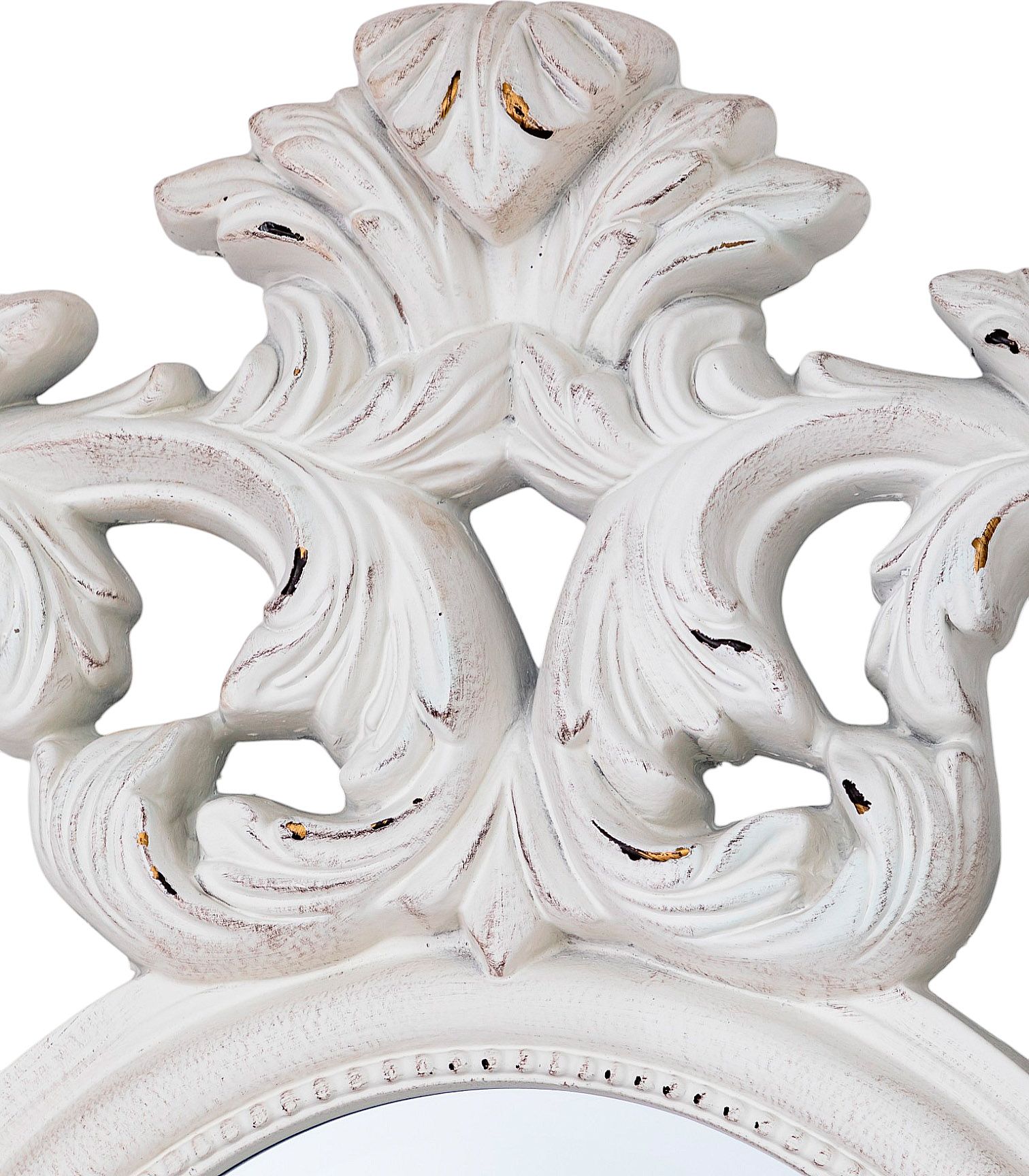 Изысканное настенное зеркало в стиле барокко, со штрихами античной белой отделки. Это изделие без сомнений привлечет внимание и подчеркнет красоту вашей гостиной или спальной комнаты своим неподражаемым величием.