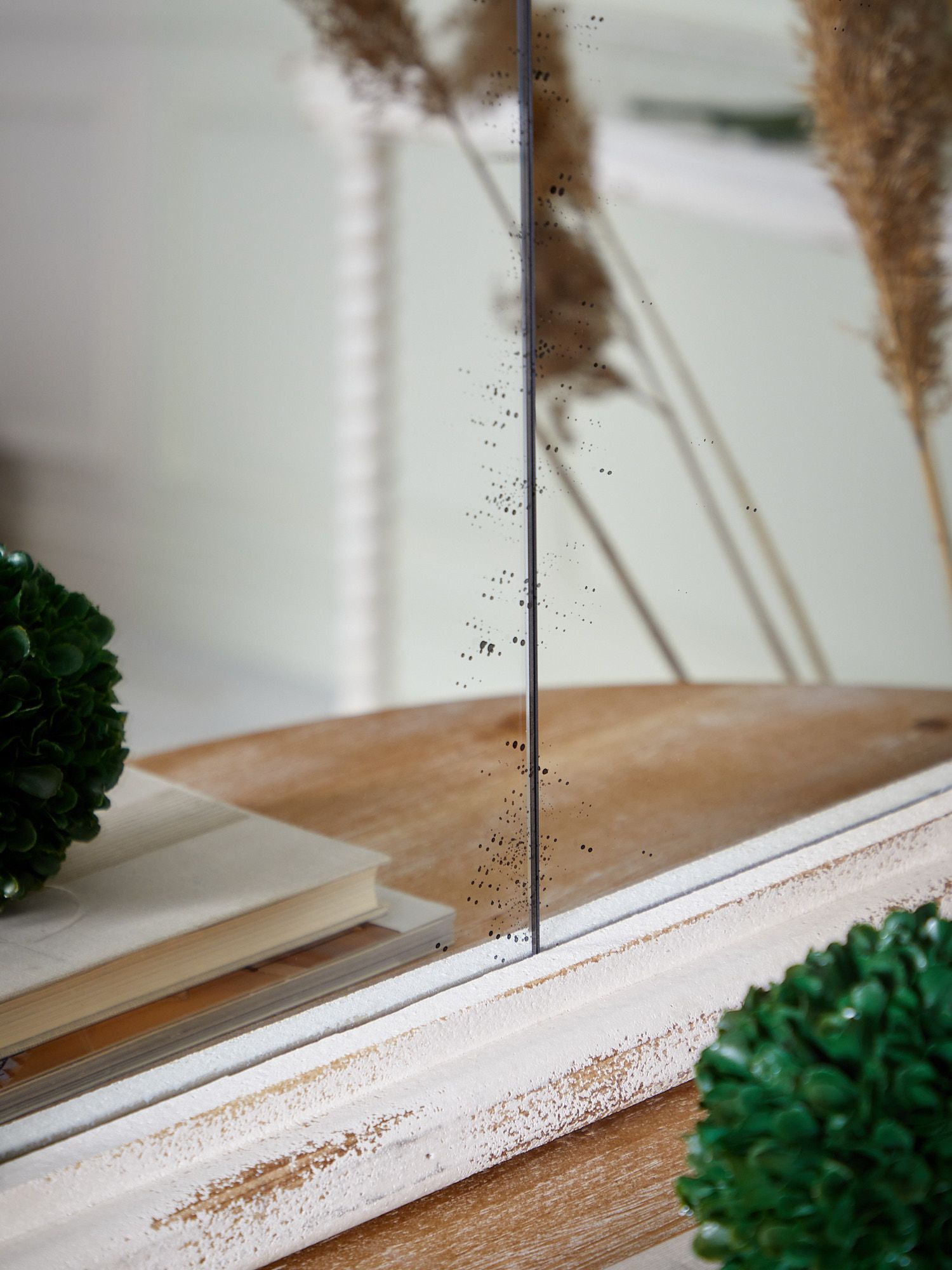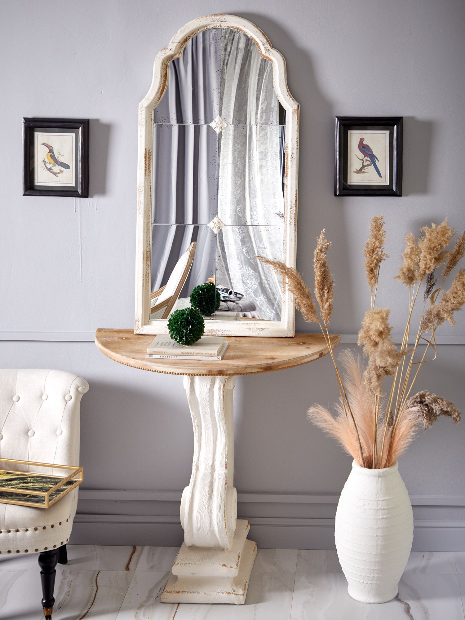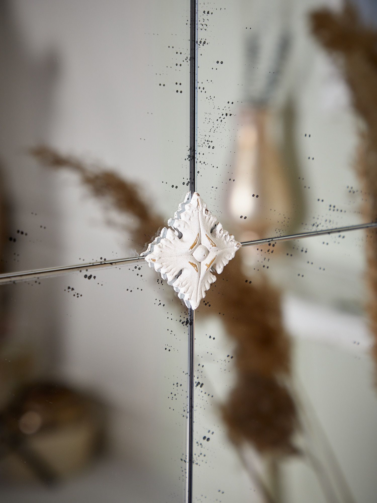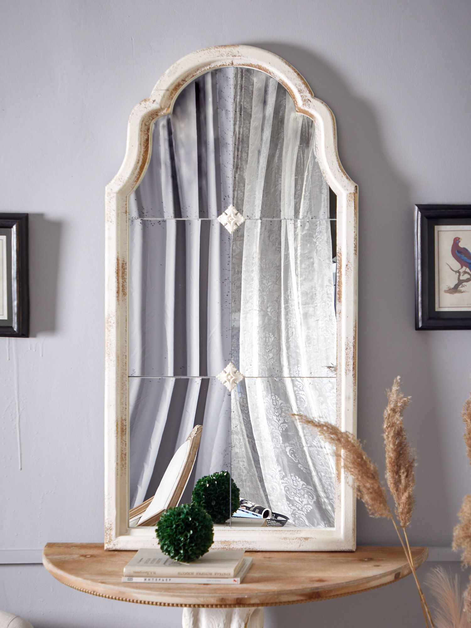 Придайте изысканность вашему интерьеру с этим антикварным настенным зеркалом с отделкой в винтажном стиле. Зеркальная часть разделена на шесть частей, украшенных двумя крестообразными фрагментами по центру, что добавляет визуальное увеличение пространства. Это изделие без сомнений займет центральное место и подчеркнет красоту вашей гостиной или спальной комнаты. Поверхностные потертости и неровности с эффектом реставрации, трещины и сколы краски на изделии характеризуют индивидуальный подход к производству каждого предмета, создавая задуманный дизайнером античный образ ушедших эпох.