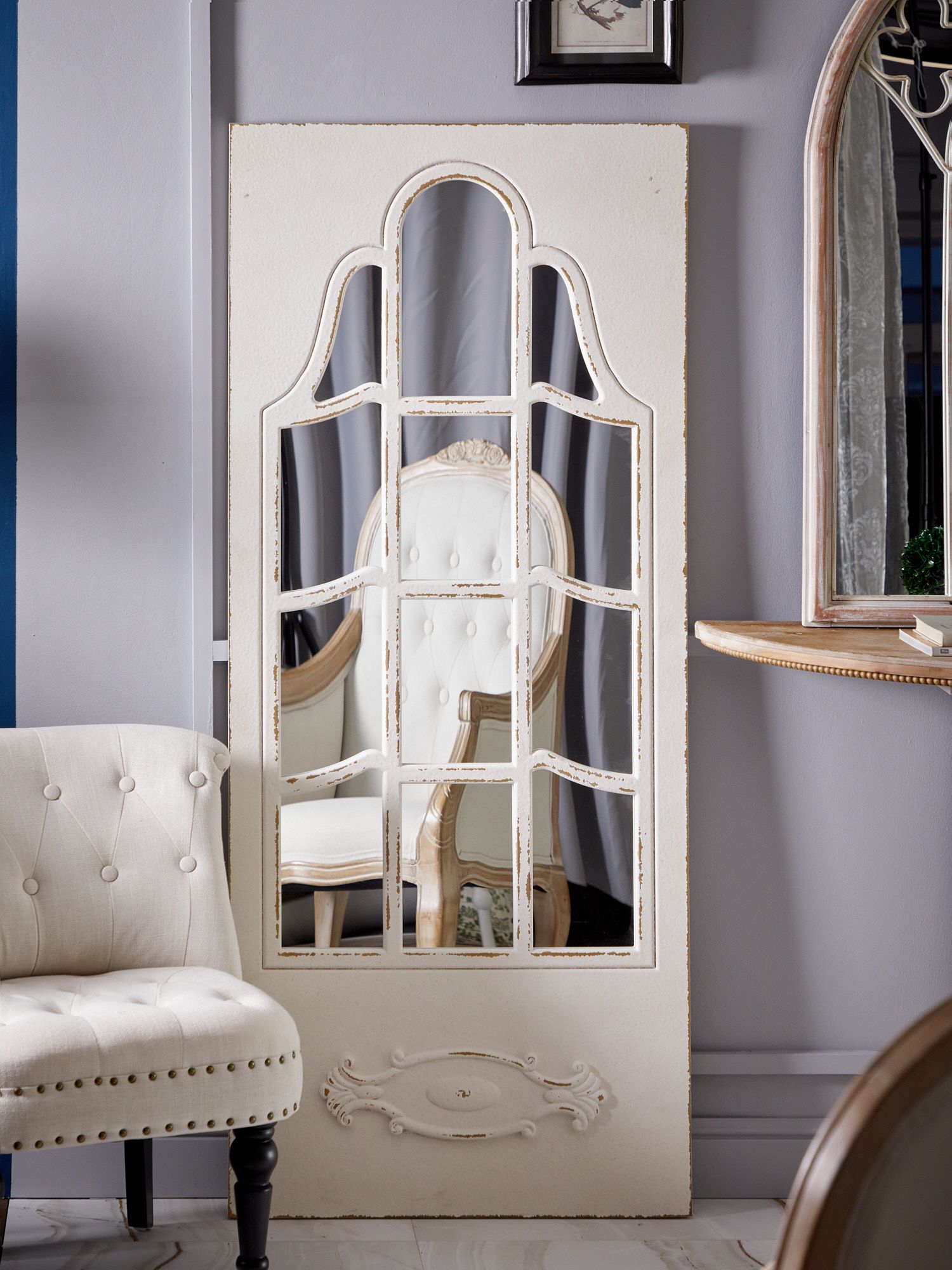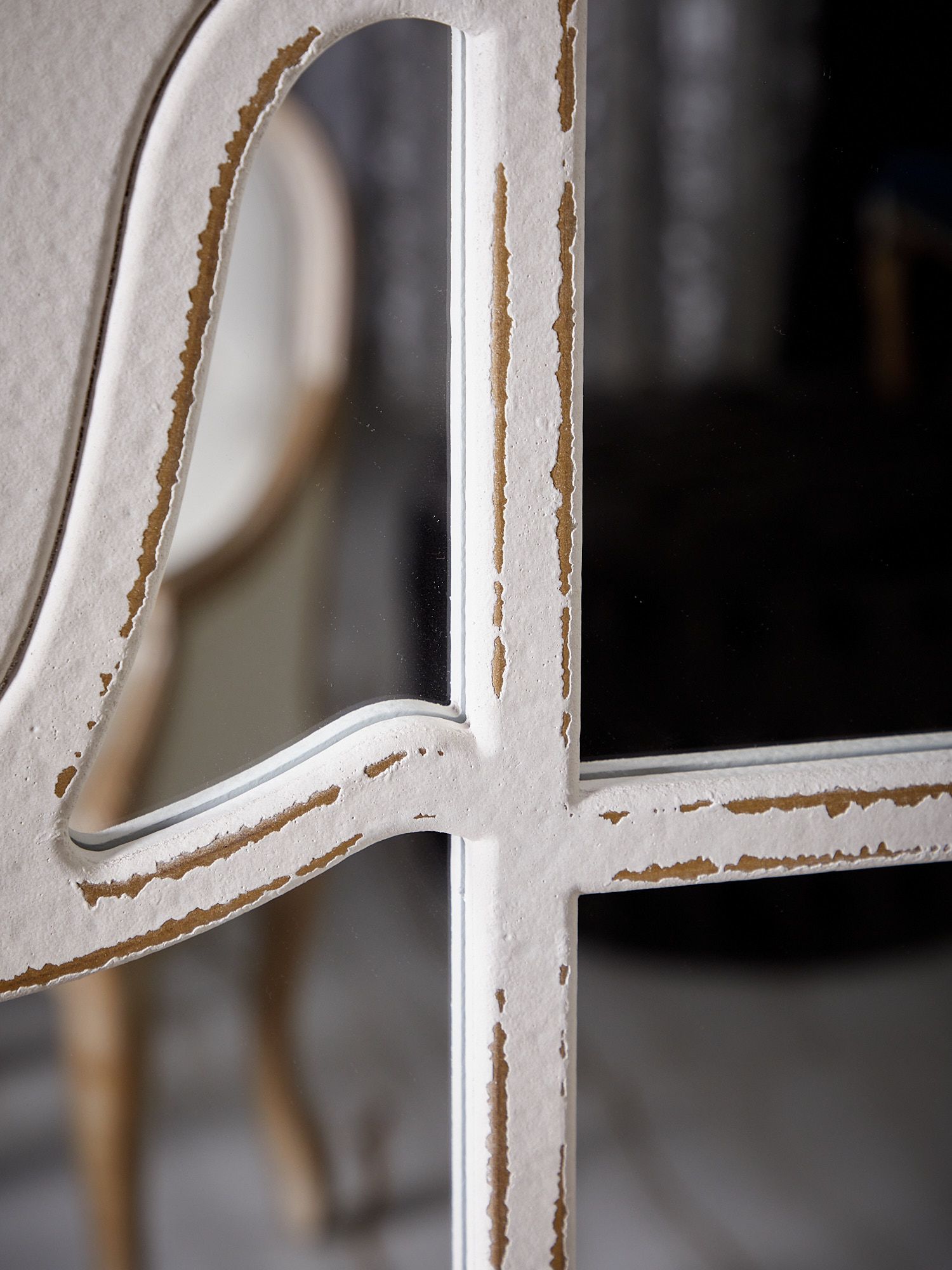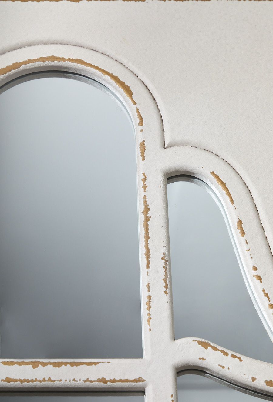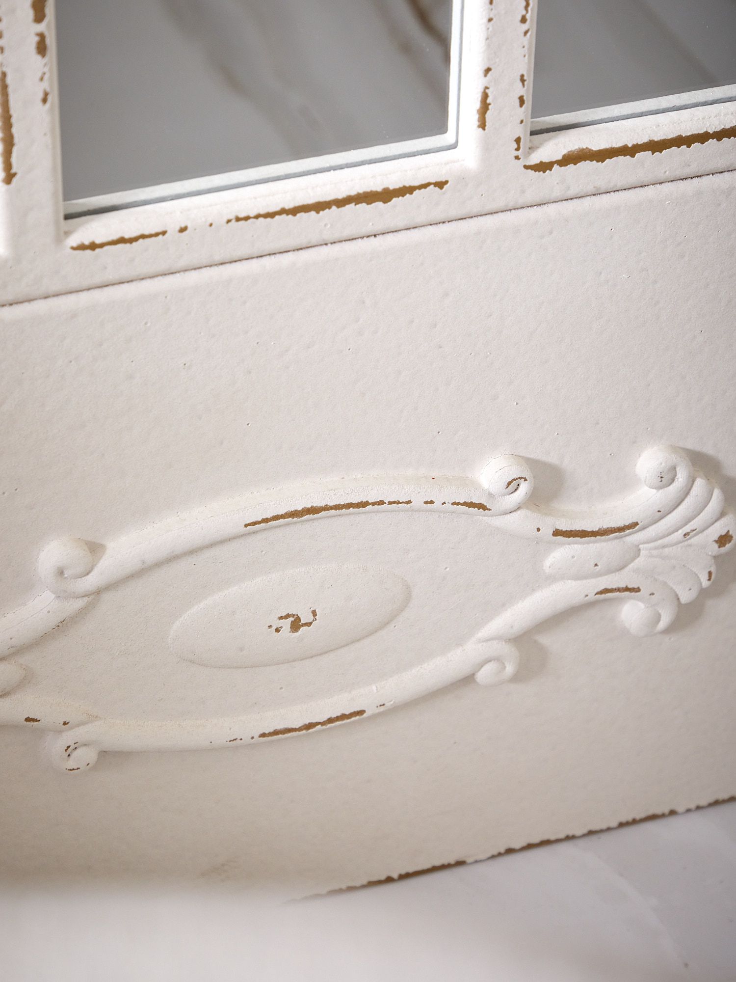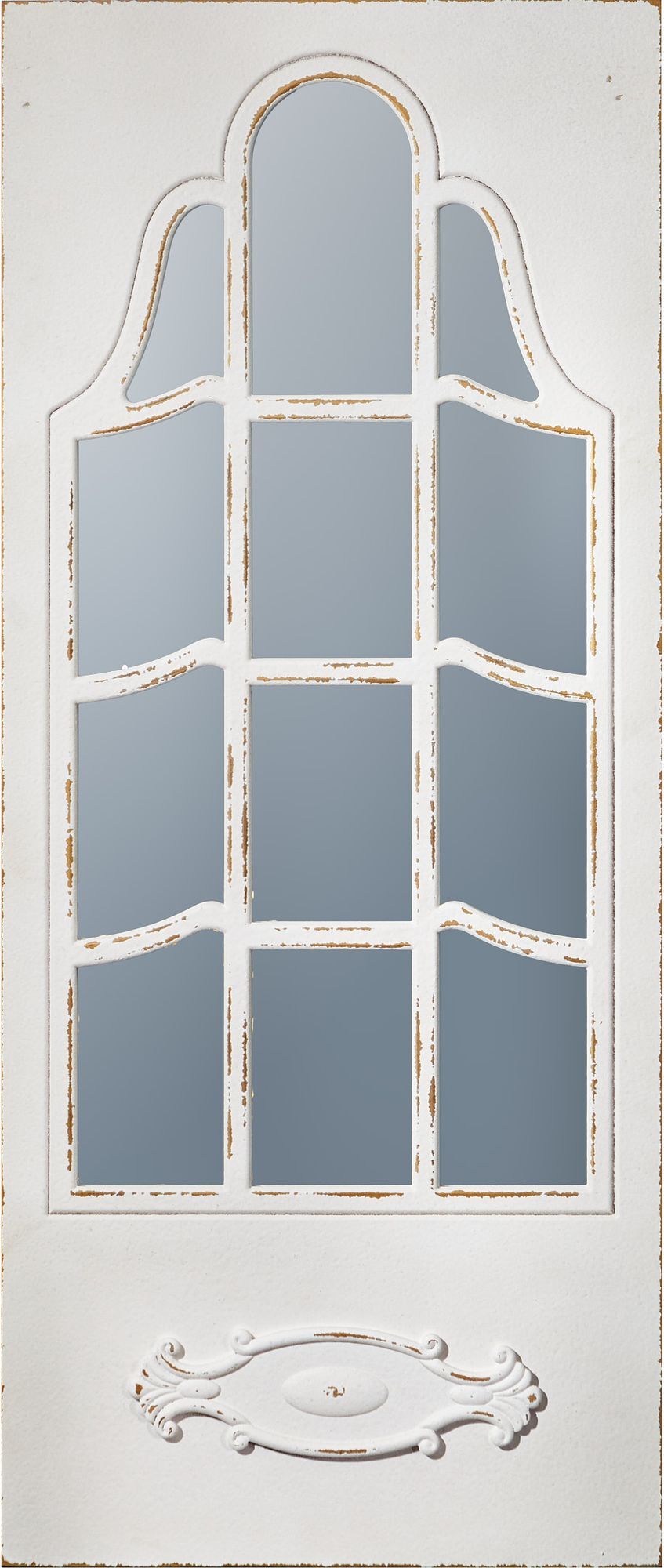 Настенное зеркало в виде силуэта двери в винтажном исполнении, украшенного перегородками и фигурными фрагментами, привнесет величественный образ ушедших эпох в ваш дом. Это изделие без сомнений займет центральное место и подчеркнет красоту вашей гостиной или спальной комнаты, визуально увеличивая пространство помещения. Поверхностные потертости и неровности с эффектом реставрации, трещины и сколы краски на изделии характеризуют индивидуальный подход к производству каждого предмета, создавая задуманный дизайнером античный образ ушедших эпох.