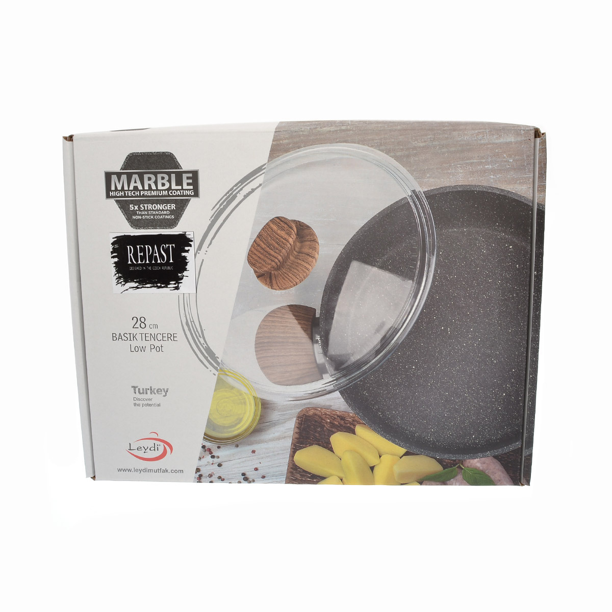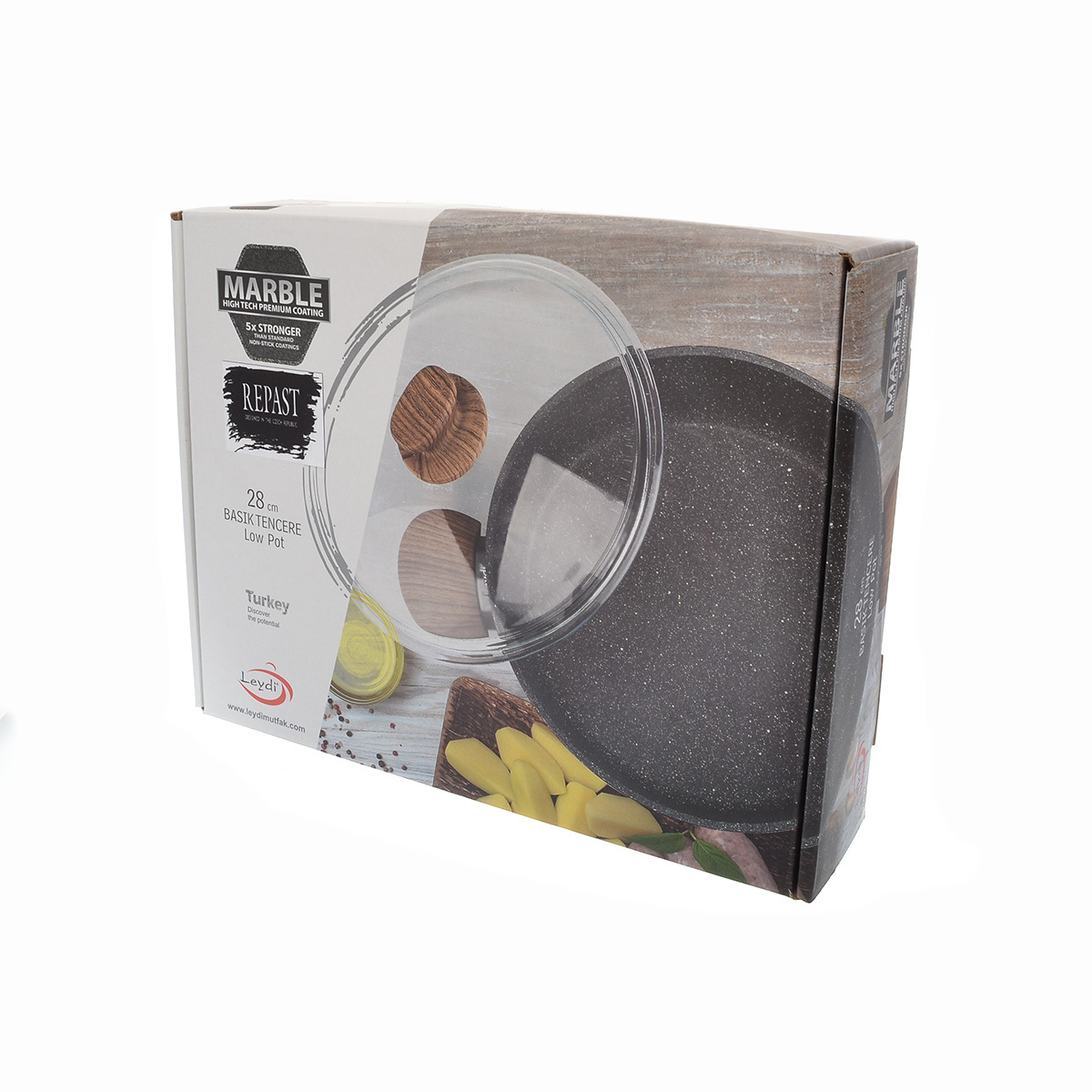 Жаровня со стеклянной крышкой с внутренним и внешним антипригарным покрытием и металлическими ручками «под золото» - это возможность продемонстрировать все свои кулинарные способности. В ней можно запекать, жарить, тушить, томить, варить… Наша новинка имеет многослойное антипригарное покрытие, которое обуславливает не только высокие антипригарные качества и удобство использования, но и минимизацию использования масла. Жаровни, кастрюли, сковородки и наборы качественной посуды для приготовления разнообразных блюд представляет торговая марка из Турции Repast!